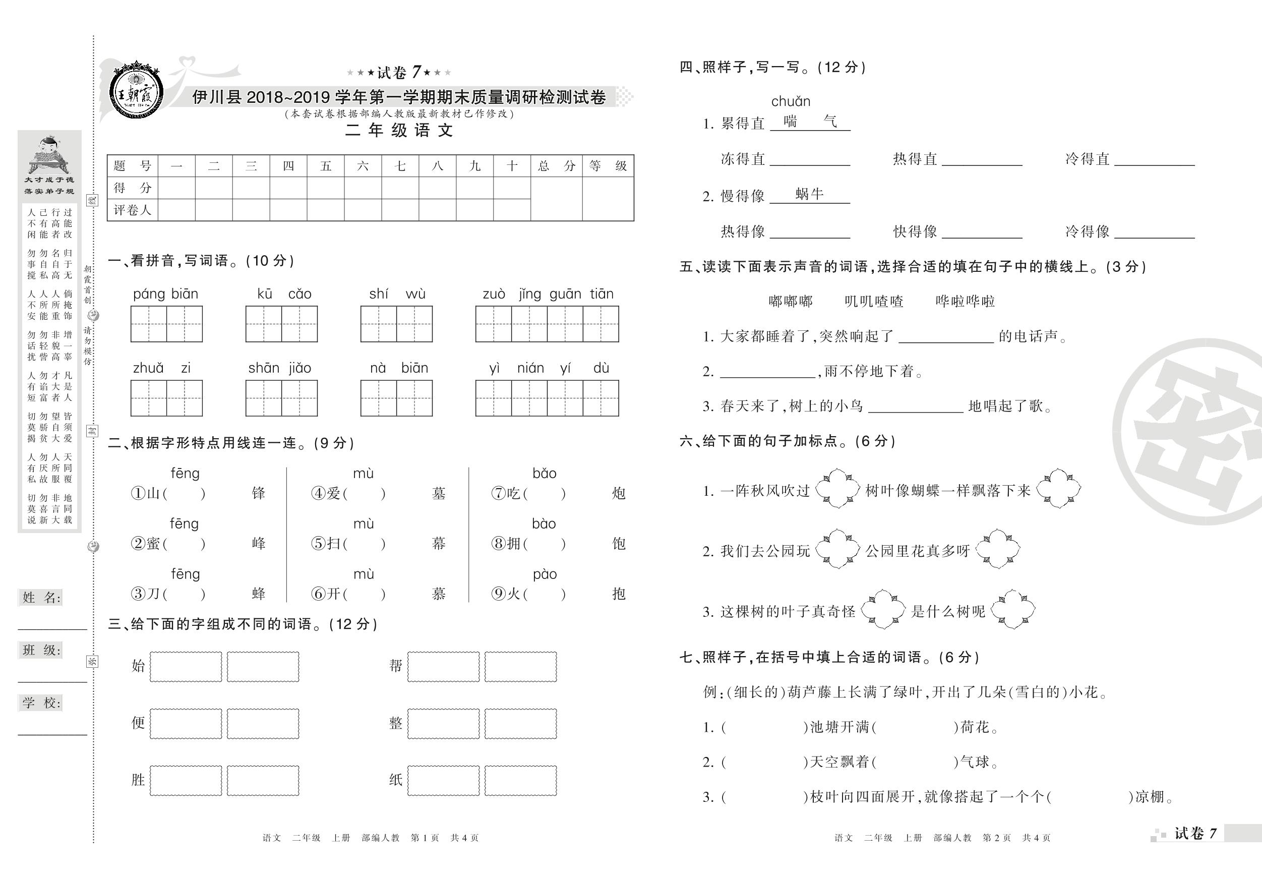 2018-2019学年第一学期洛阳市伊川县二年级语文试卷(人教版)【7】