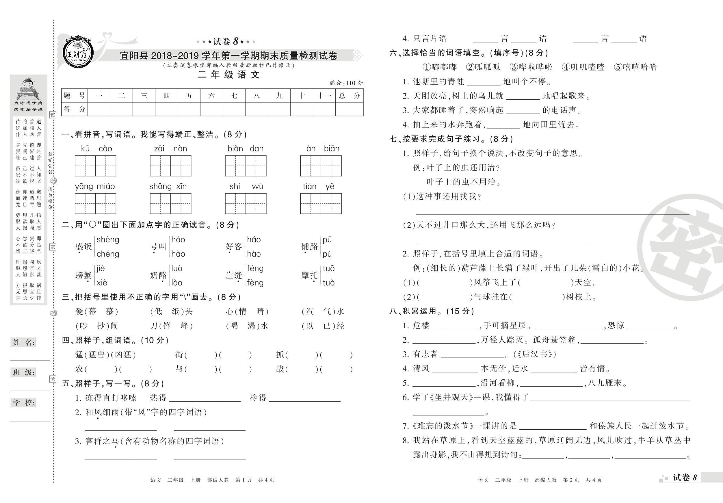 2018-2019学年第一学期洛阳市宜阳县二年级语文试卷(人教版)【8】