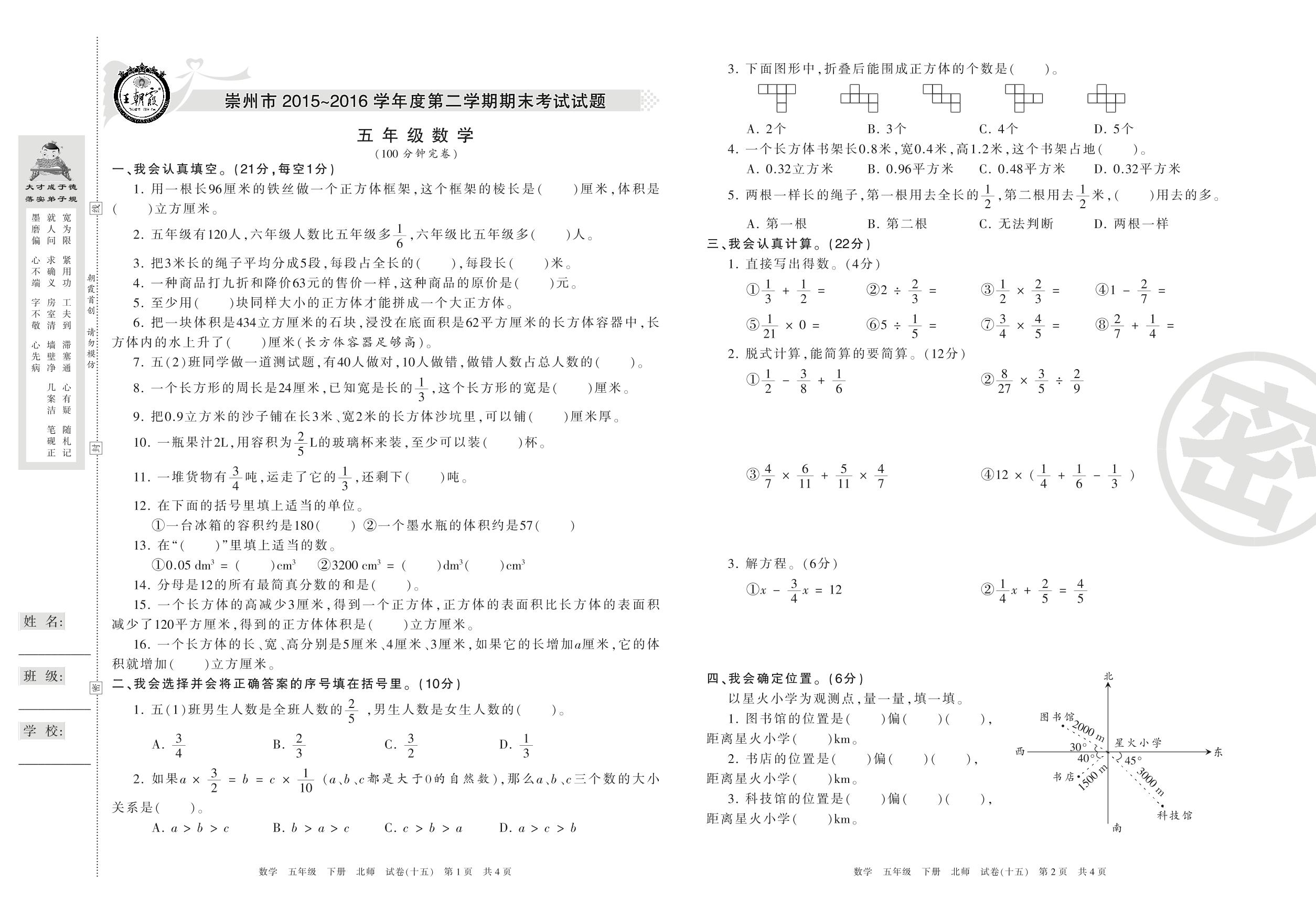 2015-2016学年第二学期邛崃市五年级数学试卷(北师版)【15】