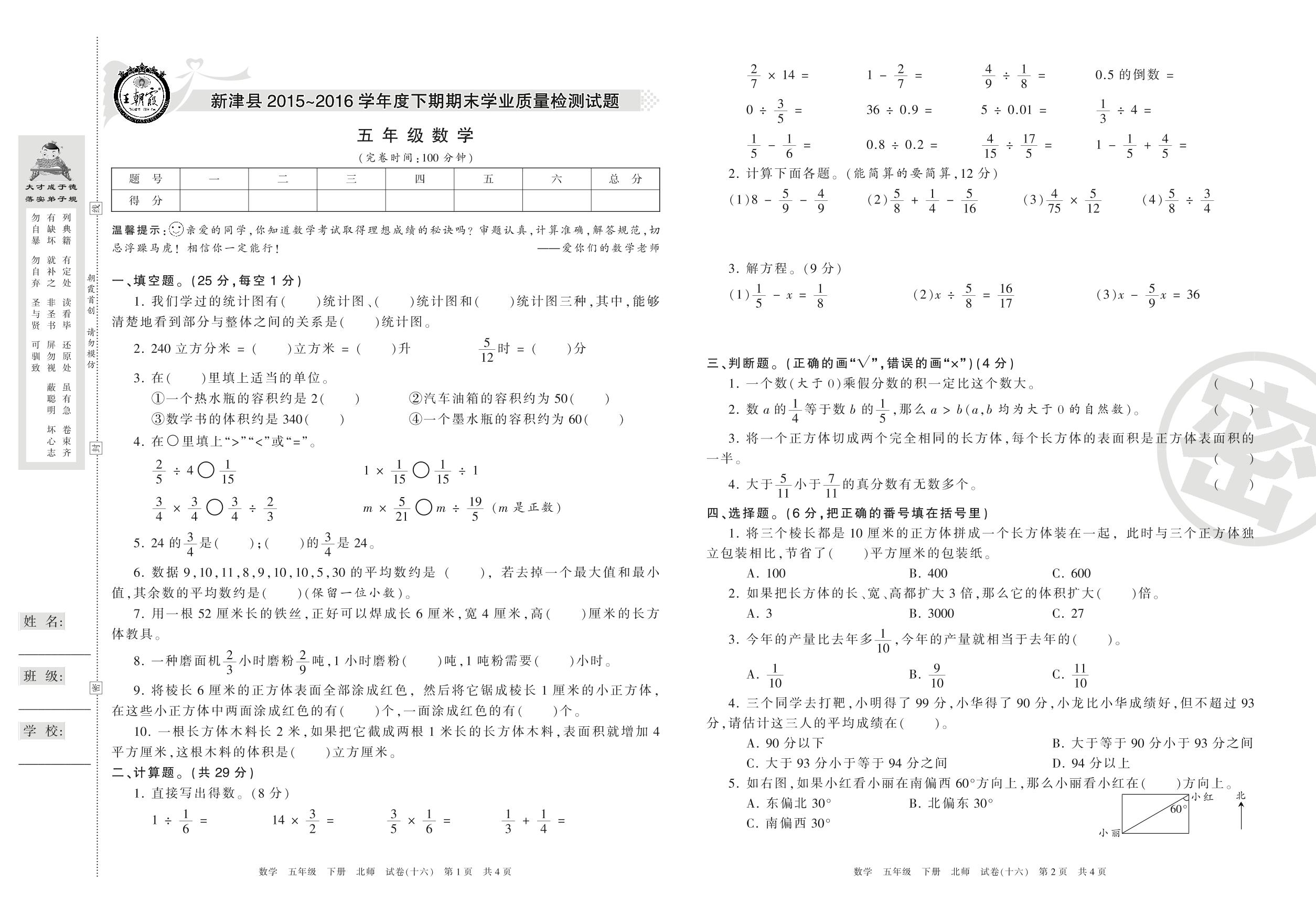 2015-2016学年第二学期崇州市五年级数学试卷(北师版)【16】