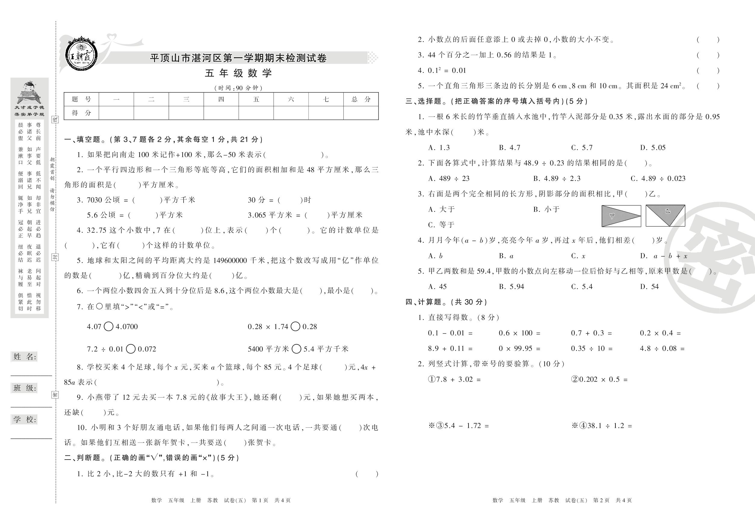 2016-2017学年第一学期平顶山市湛河区五年级数学试卷(苏教版)【5】