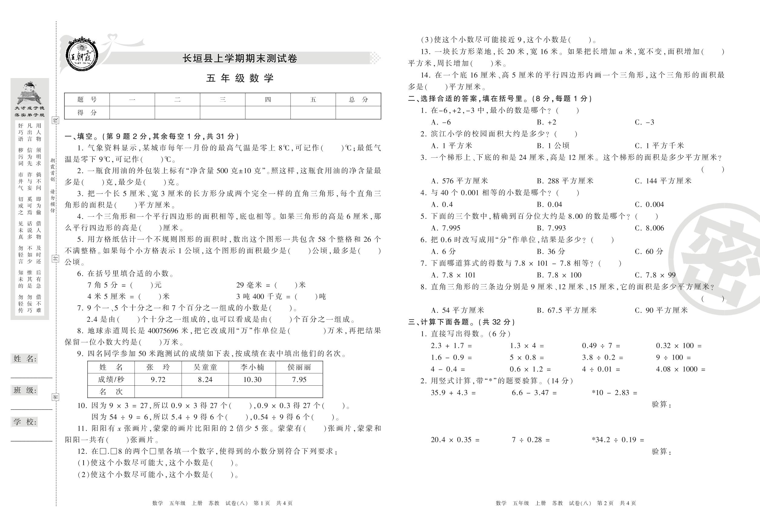 2016-2017学年第一学期新乡市长垣县五年级数学试卷(苏教版)【8】