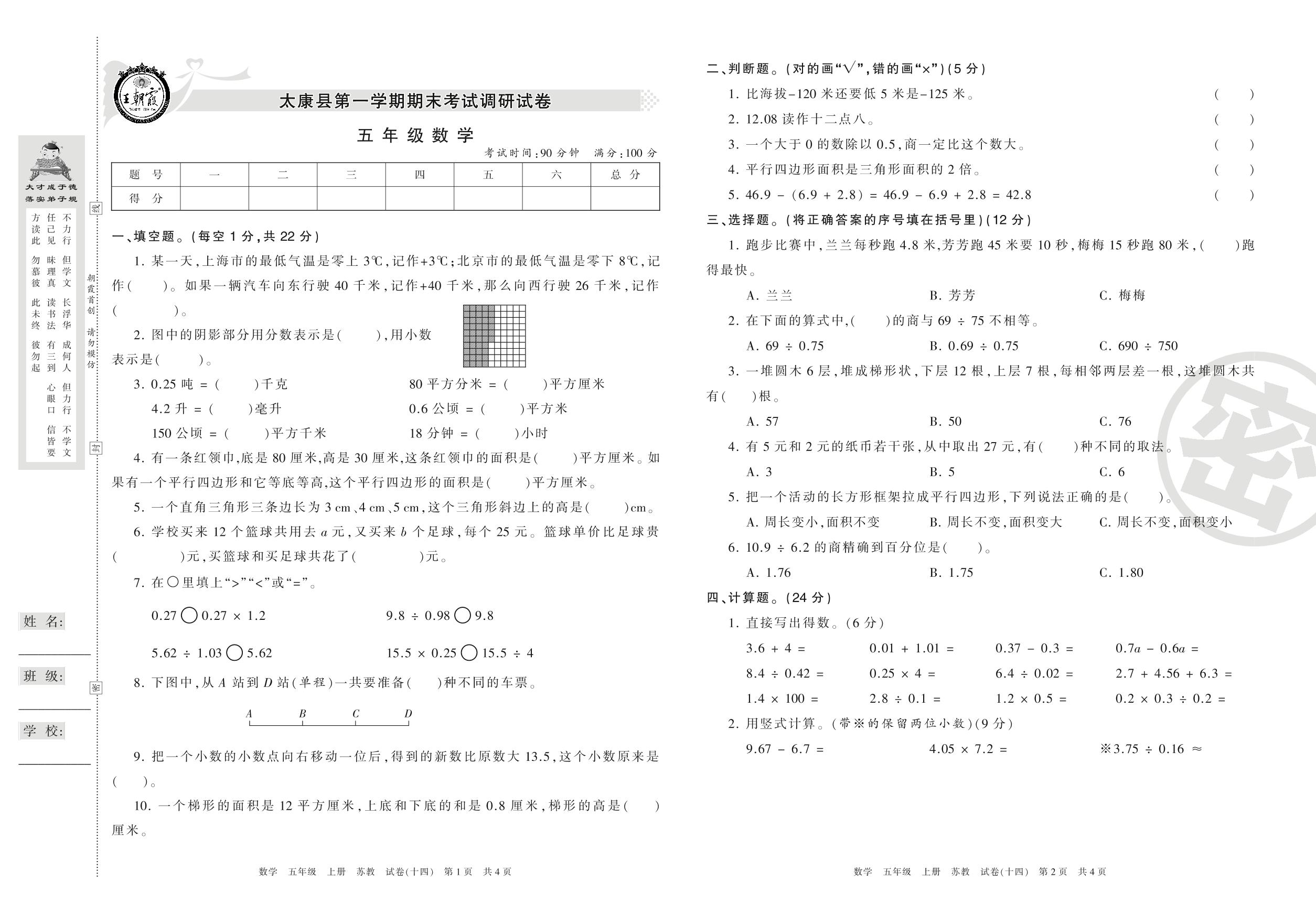 2016-2017学年第一学期周口市太康县五年级数学试卷(苏教版)【14】