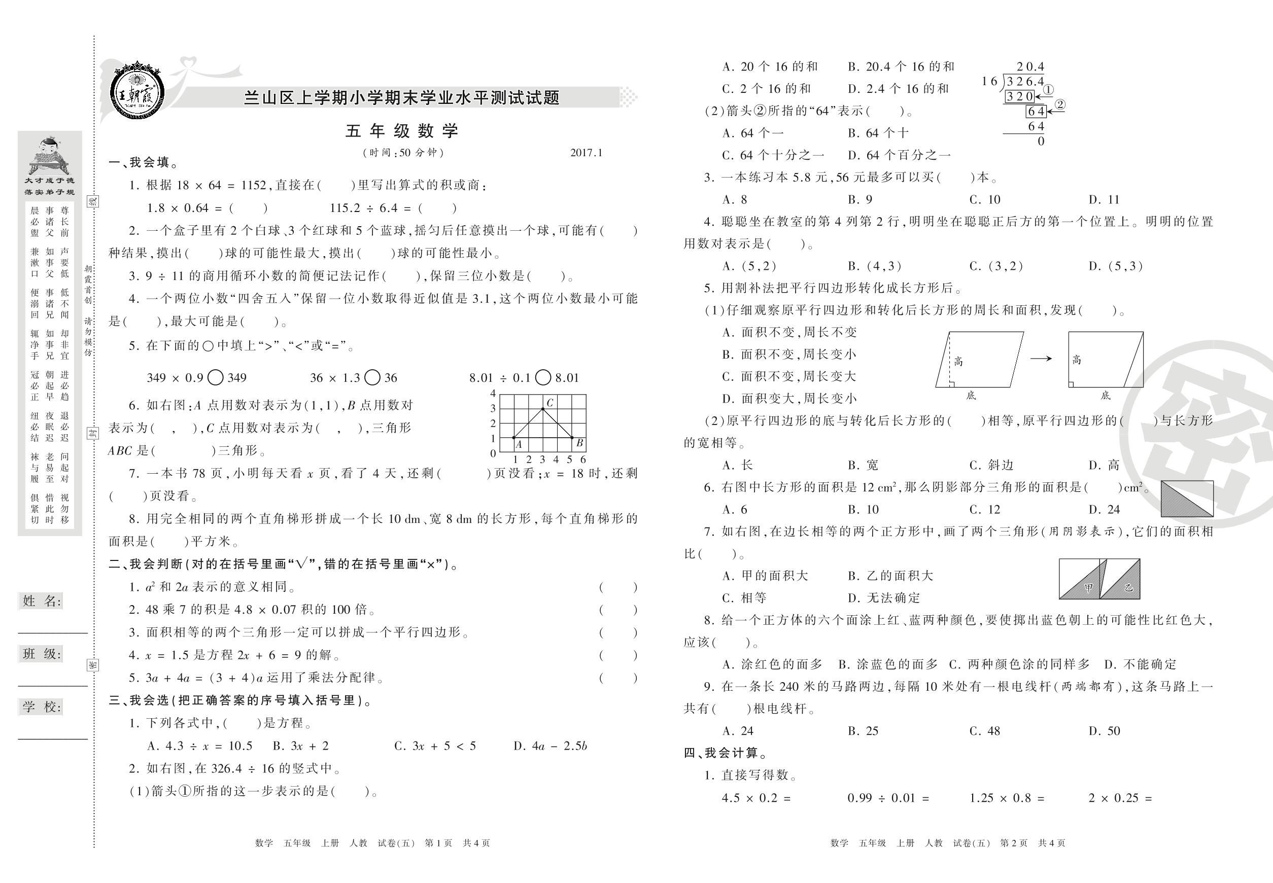 2016-2017学年第一学期临沂市兰山区五年级数学试卷(人教版)【5】