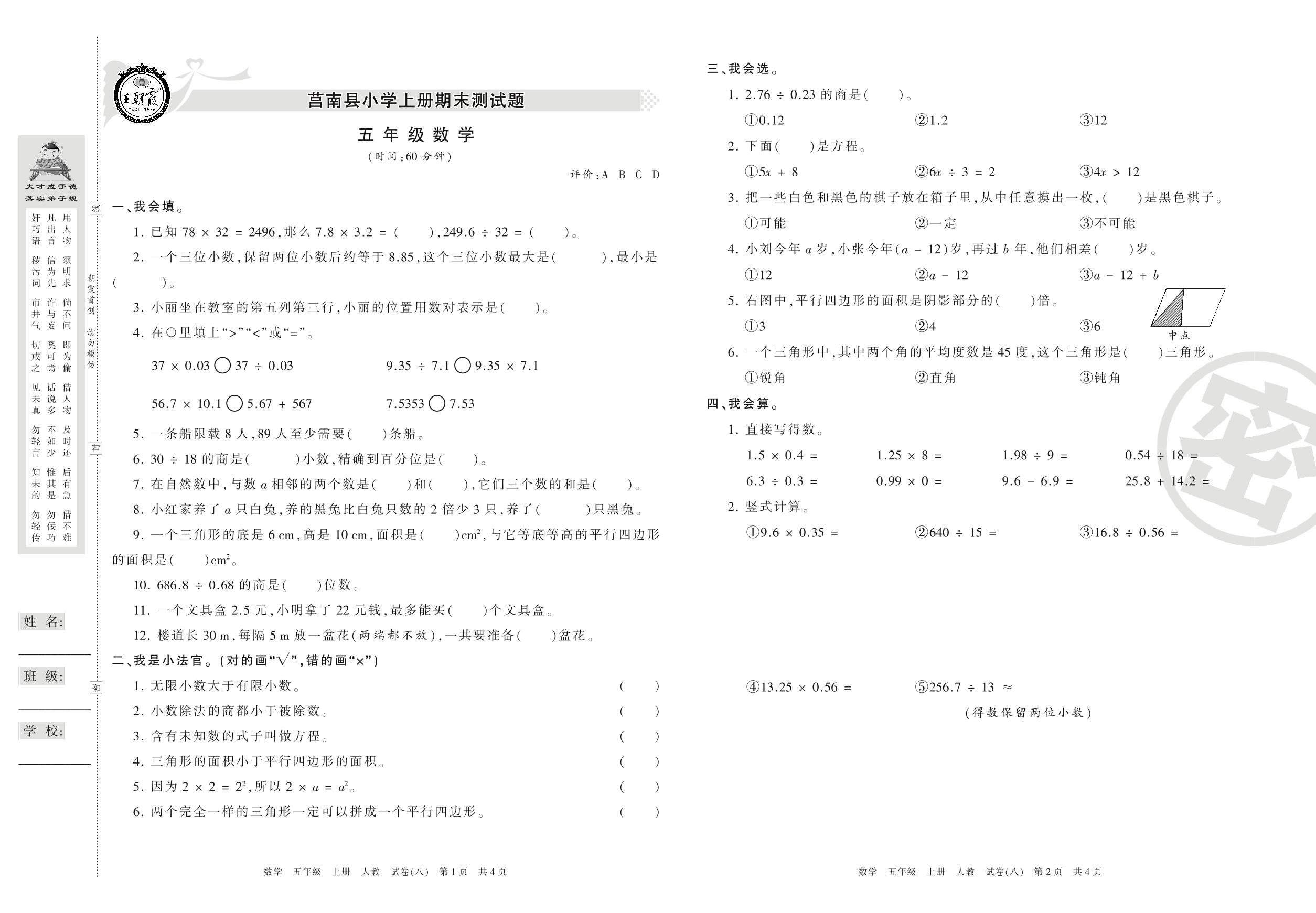 2016-2017学年第一学期临沂市莒南县五年级数学试卷(人教版)【8】