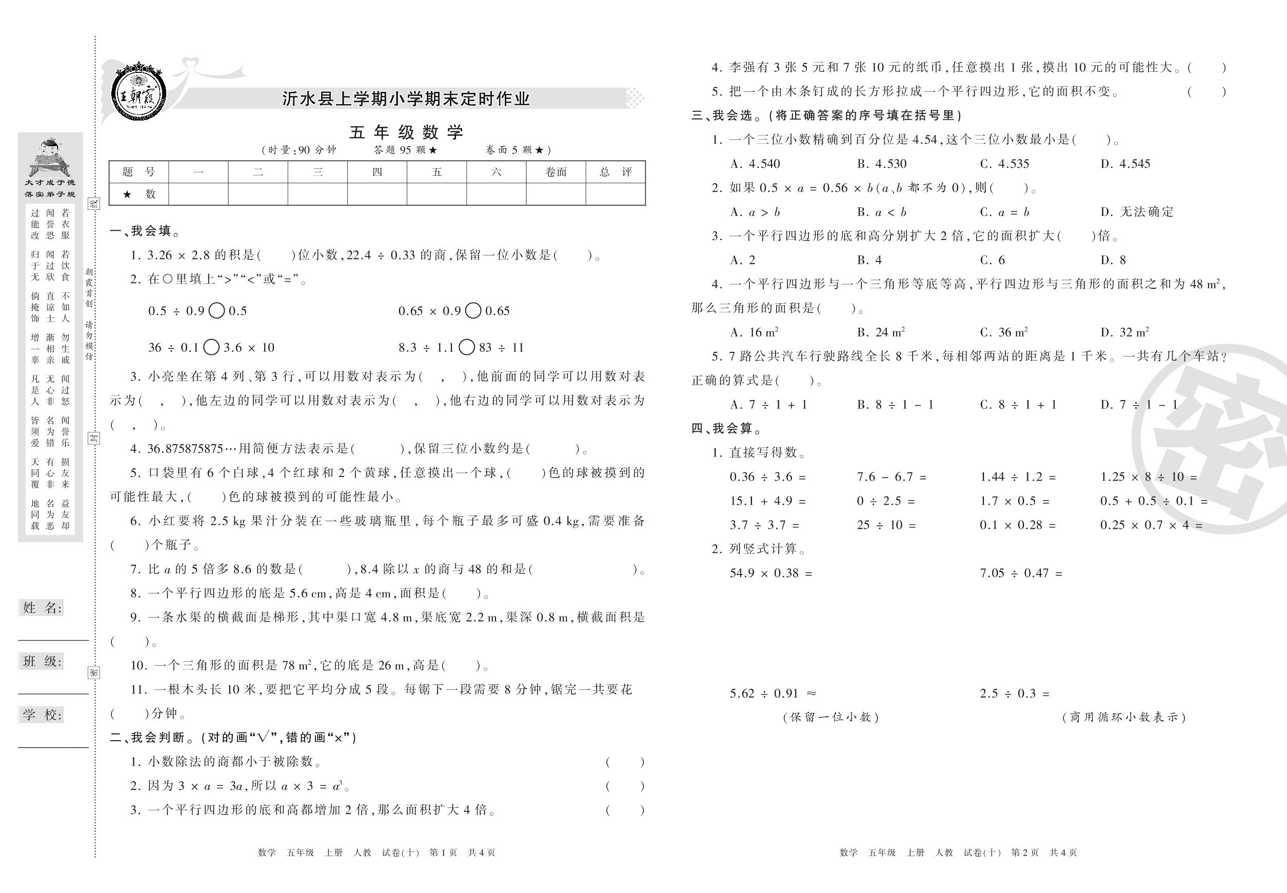 2016-2017学年第一学期临沂市沂水县五年级数学试卷(人教版)【10】
