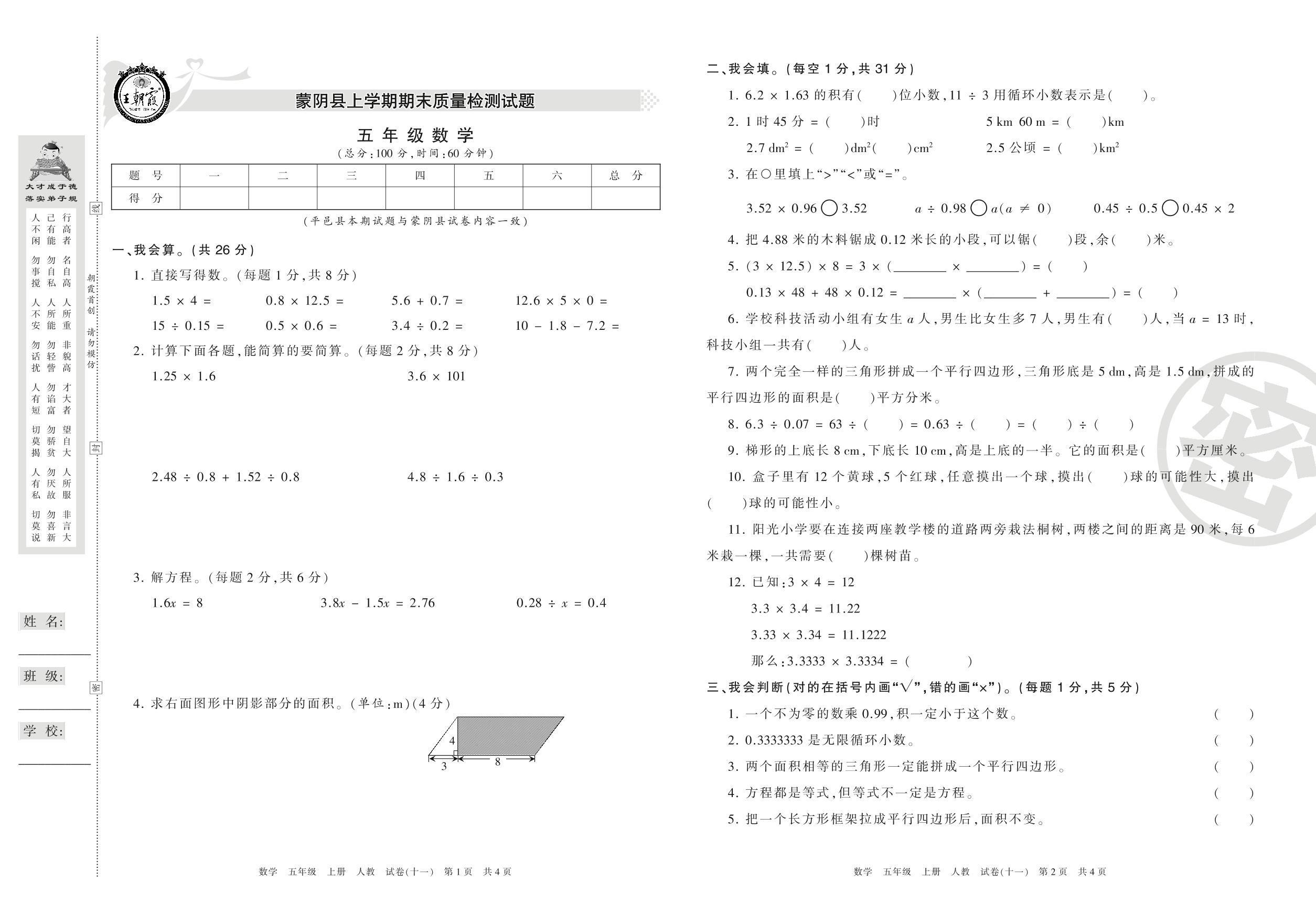 2016-2017学年第一学期临沂市蒙阴县五年级数学试卷(人教版)【11】
