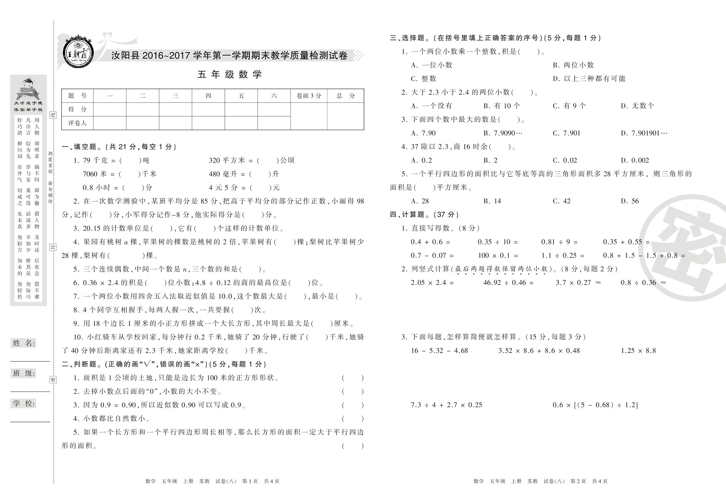 2016-2017学年第一学期洛阳市汝阳县五年级数学试卷(苏教版)【8】