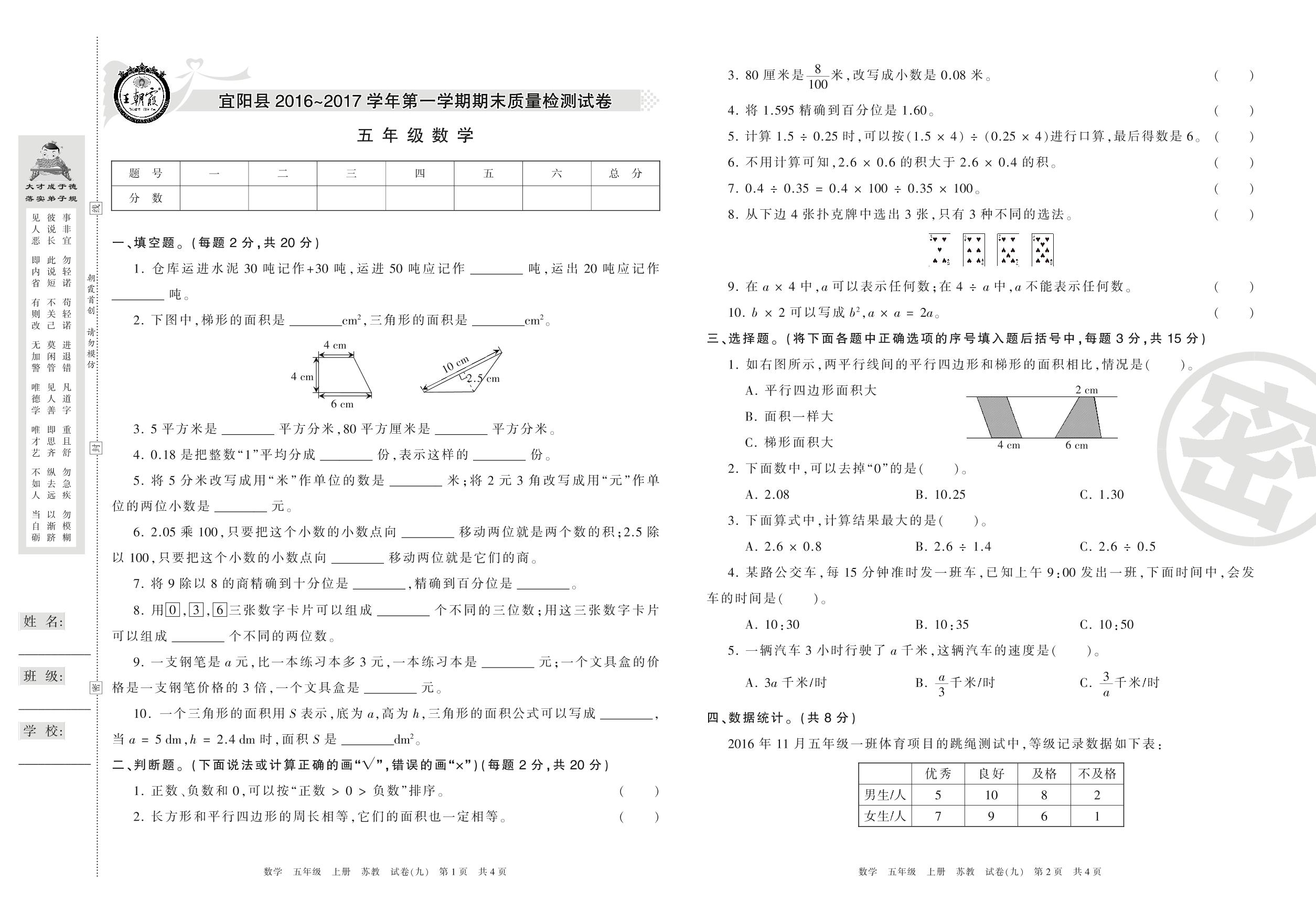 2016-2017学年第一学期洛阳市宜阳县五年级数学试卷(苏教版)【9】