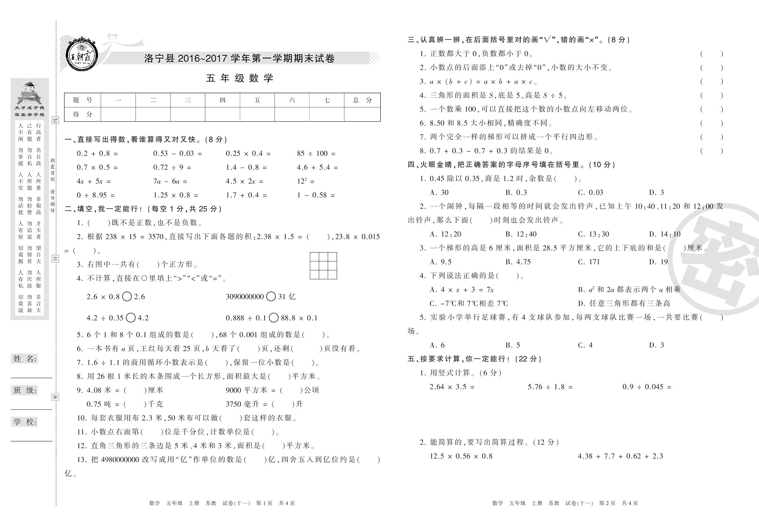 2016-2017学年第一学期洛阳市洛宁县五年级数学试卷(苏教版)【11】
