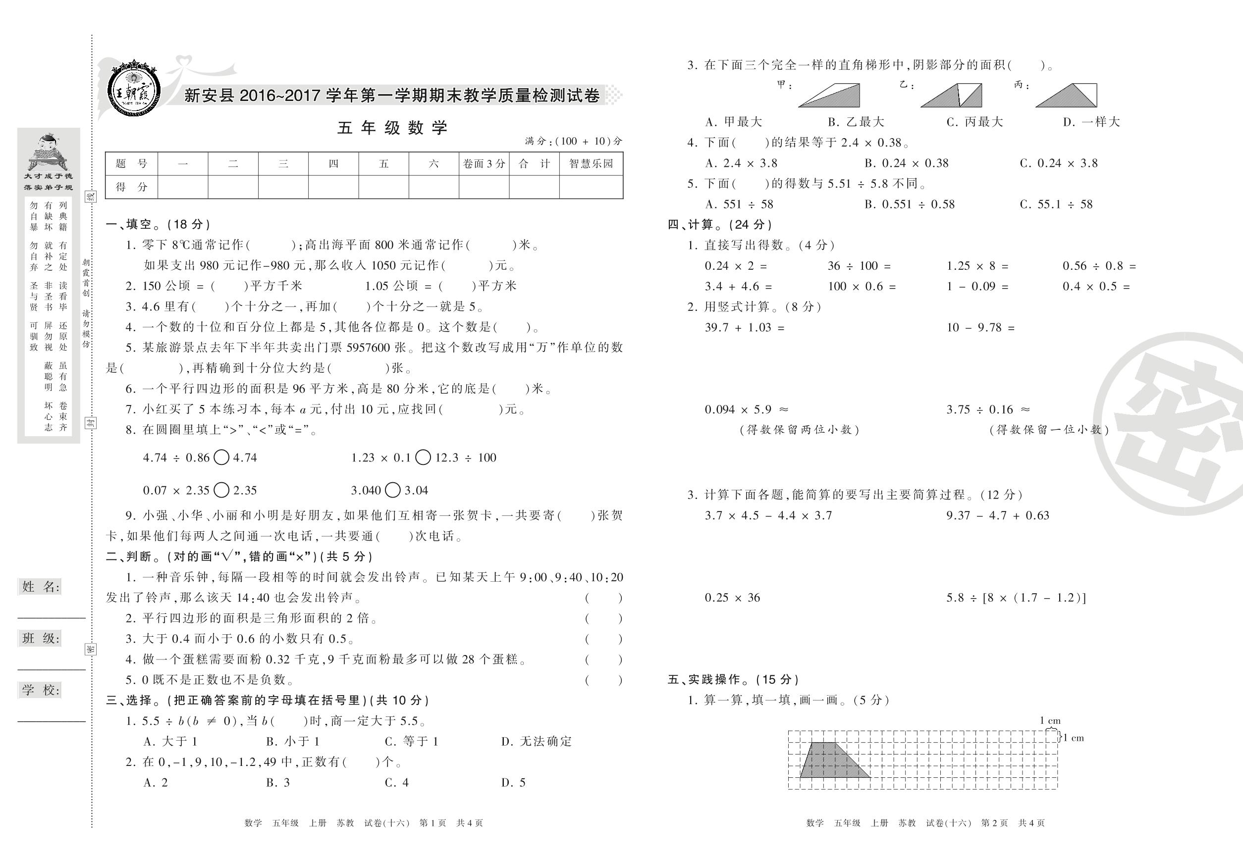 2016-2017学年第一学期洛阳市新安县五年级数学试卷(苏教版)【16】