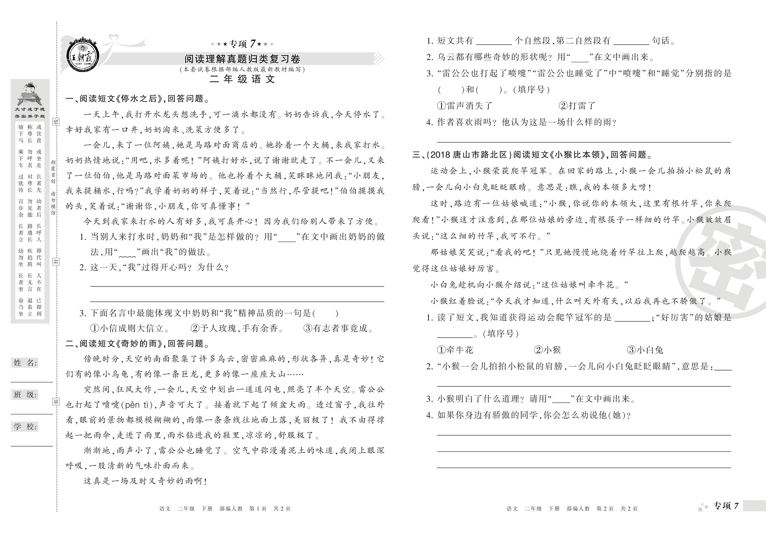 王朝霞期末专项卷——阅读理解、写话真题归类复习二年级下册语文(人教版)_R21080171526【0】