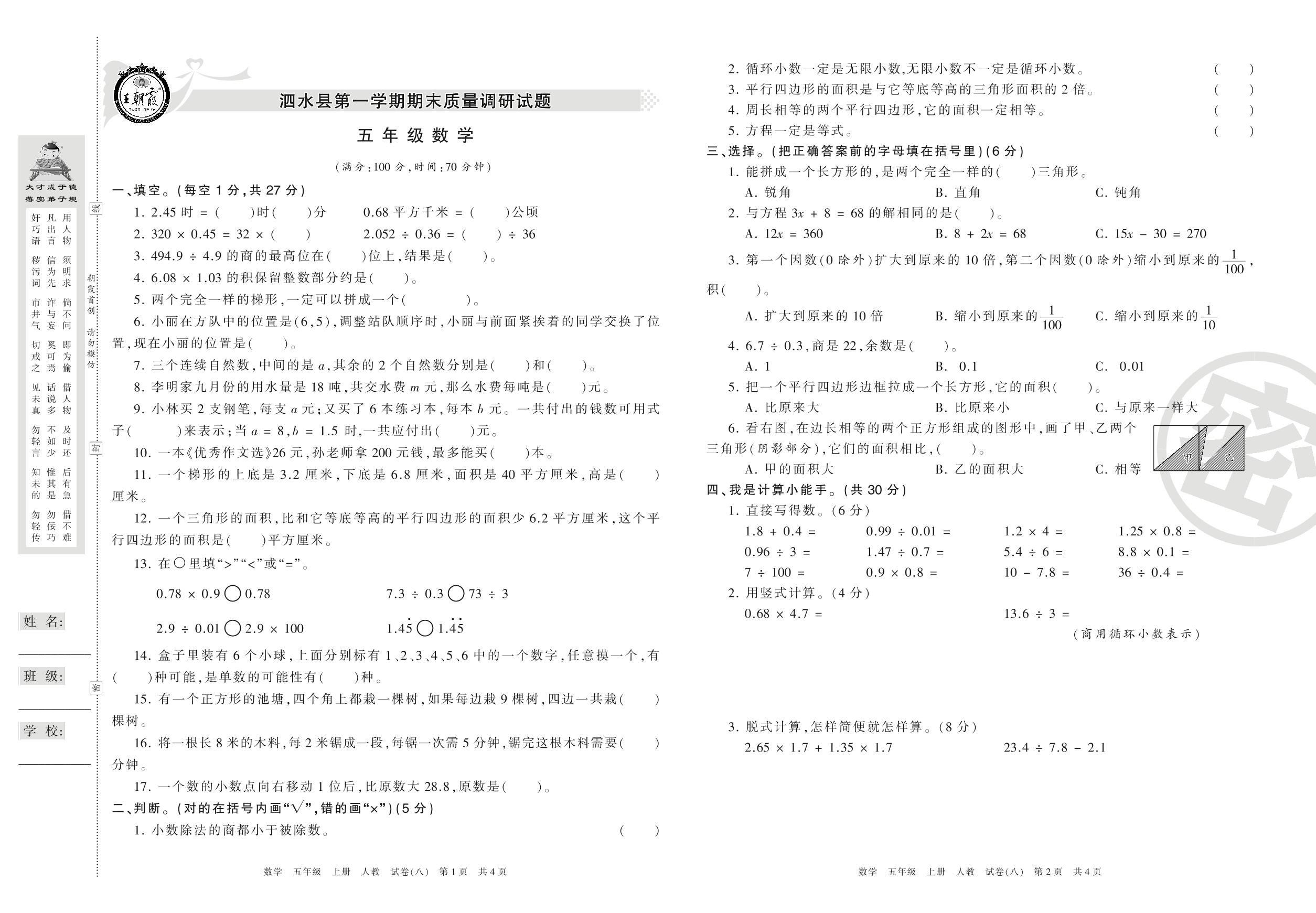 2016-2017学年第一学期济宁市泗水县五年级数学试卷(人教版)【8】