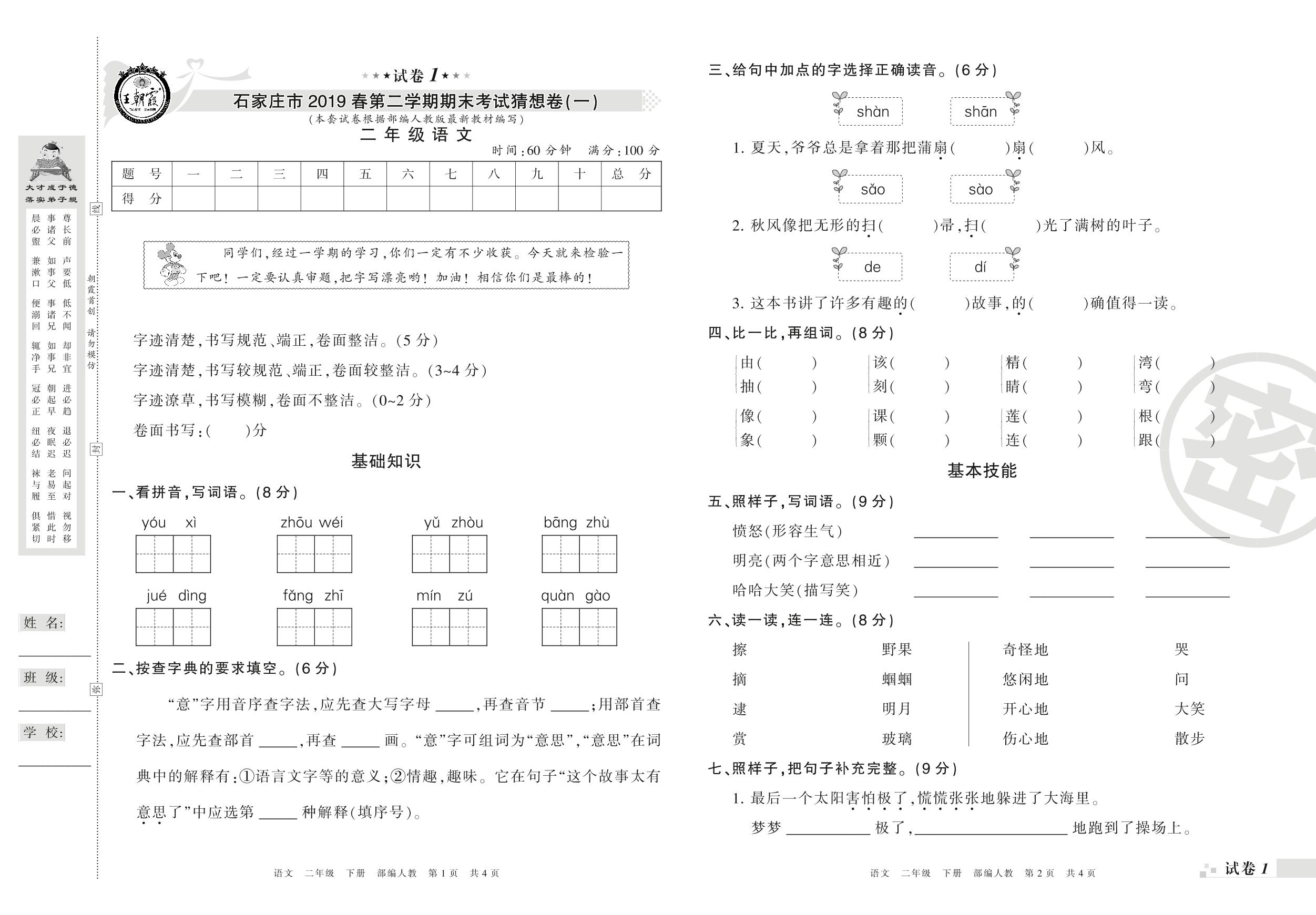 2017-2018学年第二学期石家庄市(一)二年级语文试卷(人教版)【1】