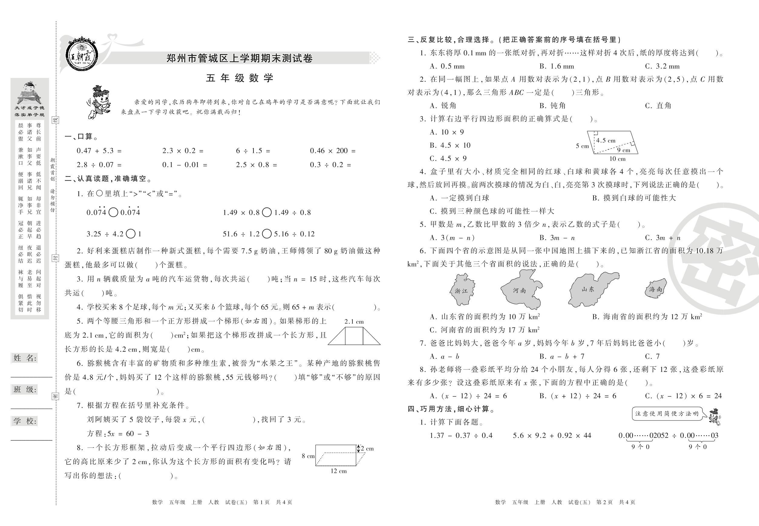 2016-2017学年第一学期郑州市管城区五年级数学试卷(人教版)【5】