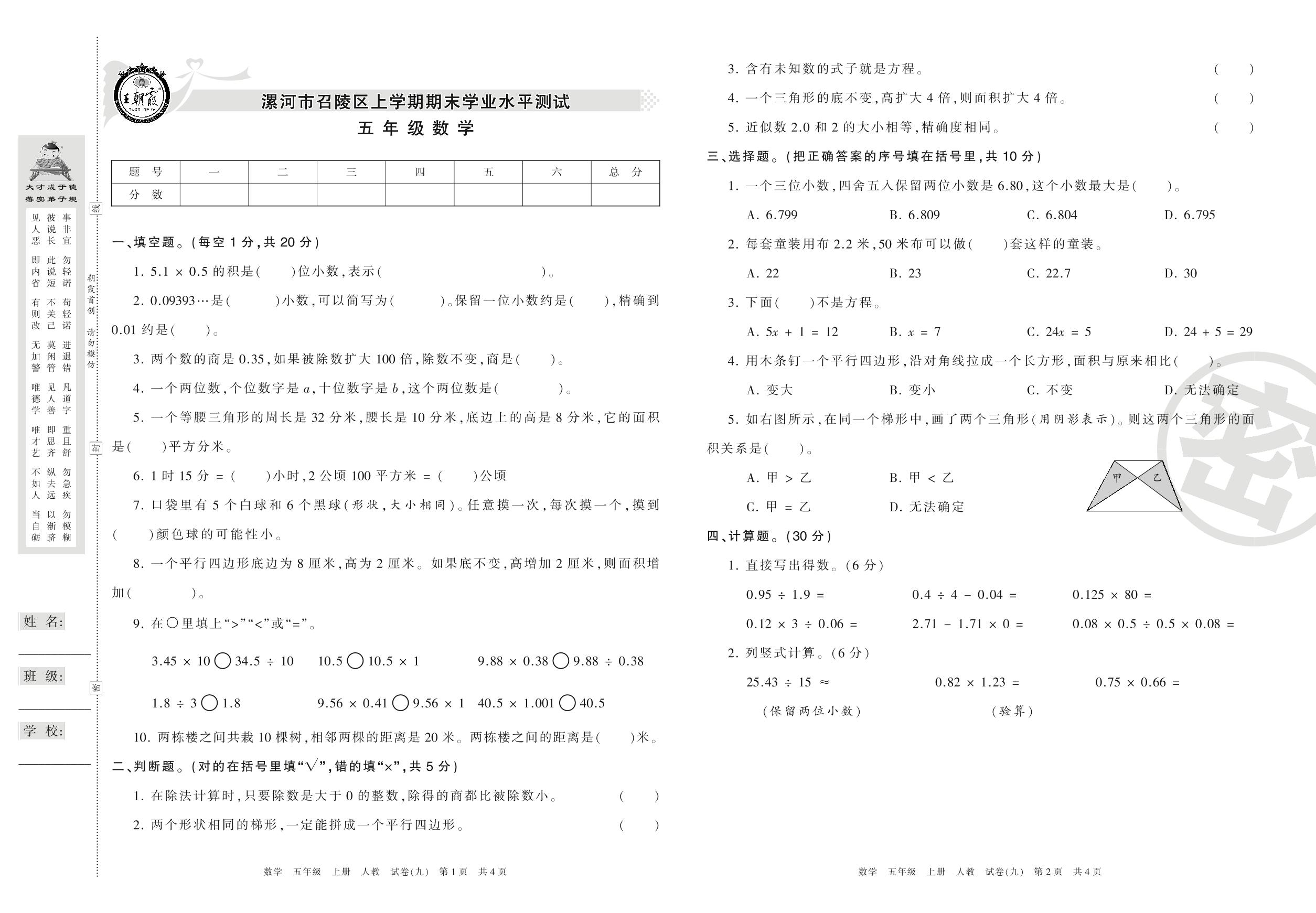 2016-2017学年第一学期漯河市召陵区五年级数学试卷(人教版)【9】