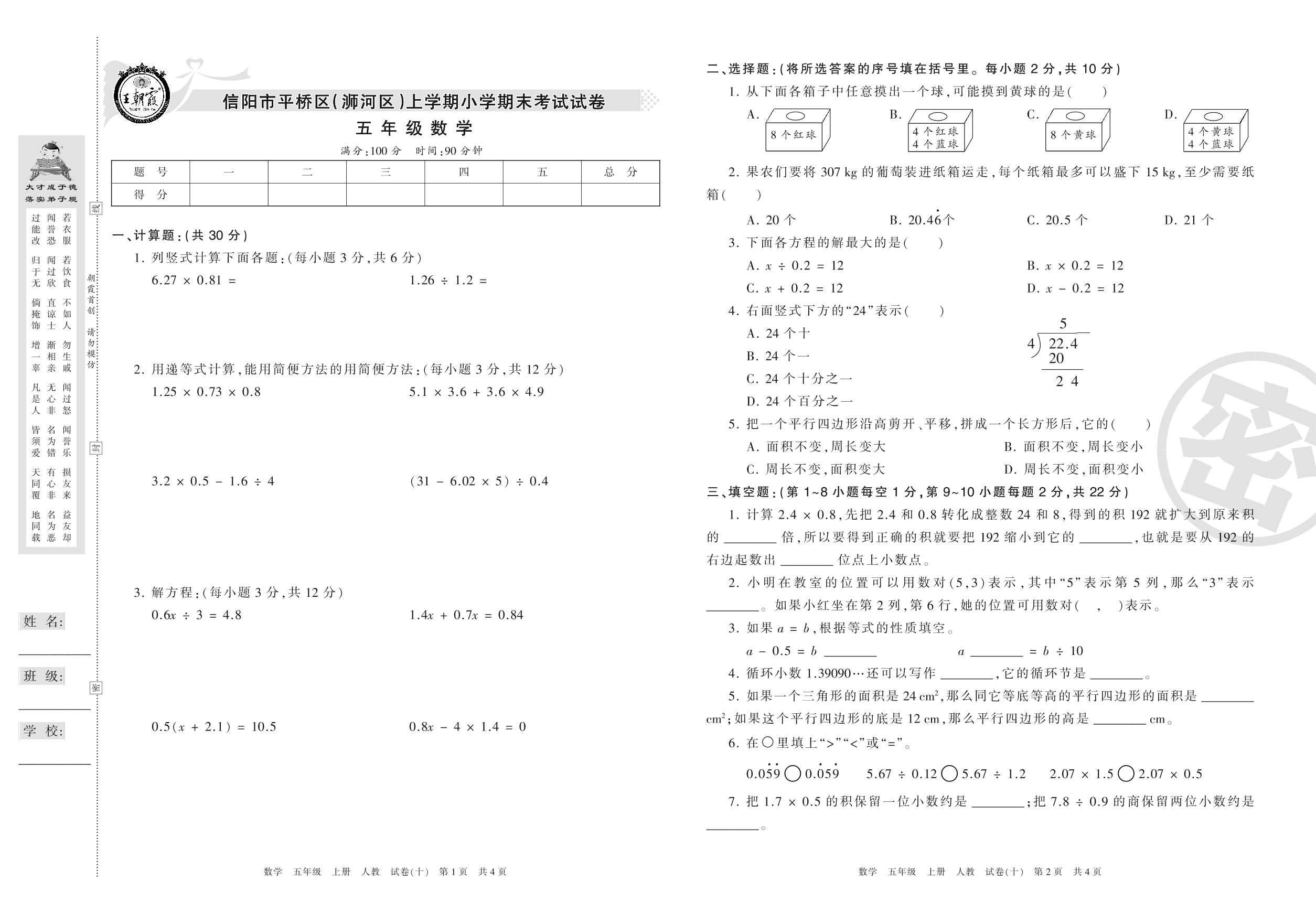 2016-2017学年第一学期信阳市平桥区(浉河区)五年级数学试卷(人教版)【10】