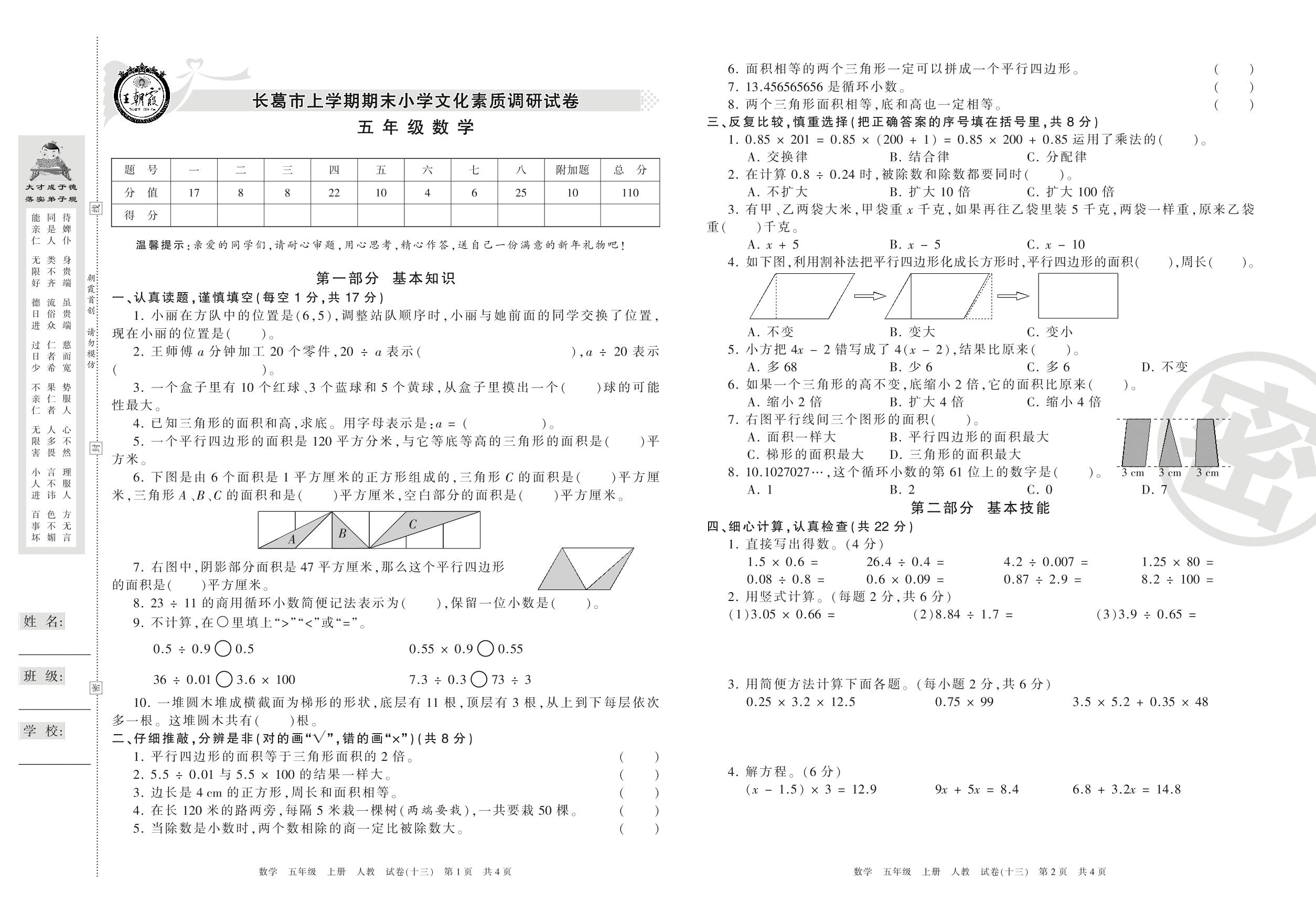 2016-2017学年第一学期长葛市五年级数学试卷(人教版)【13】