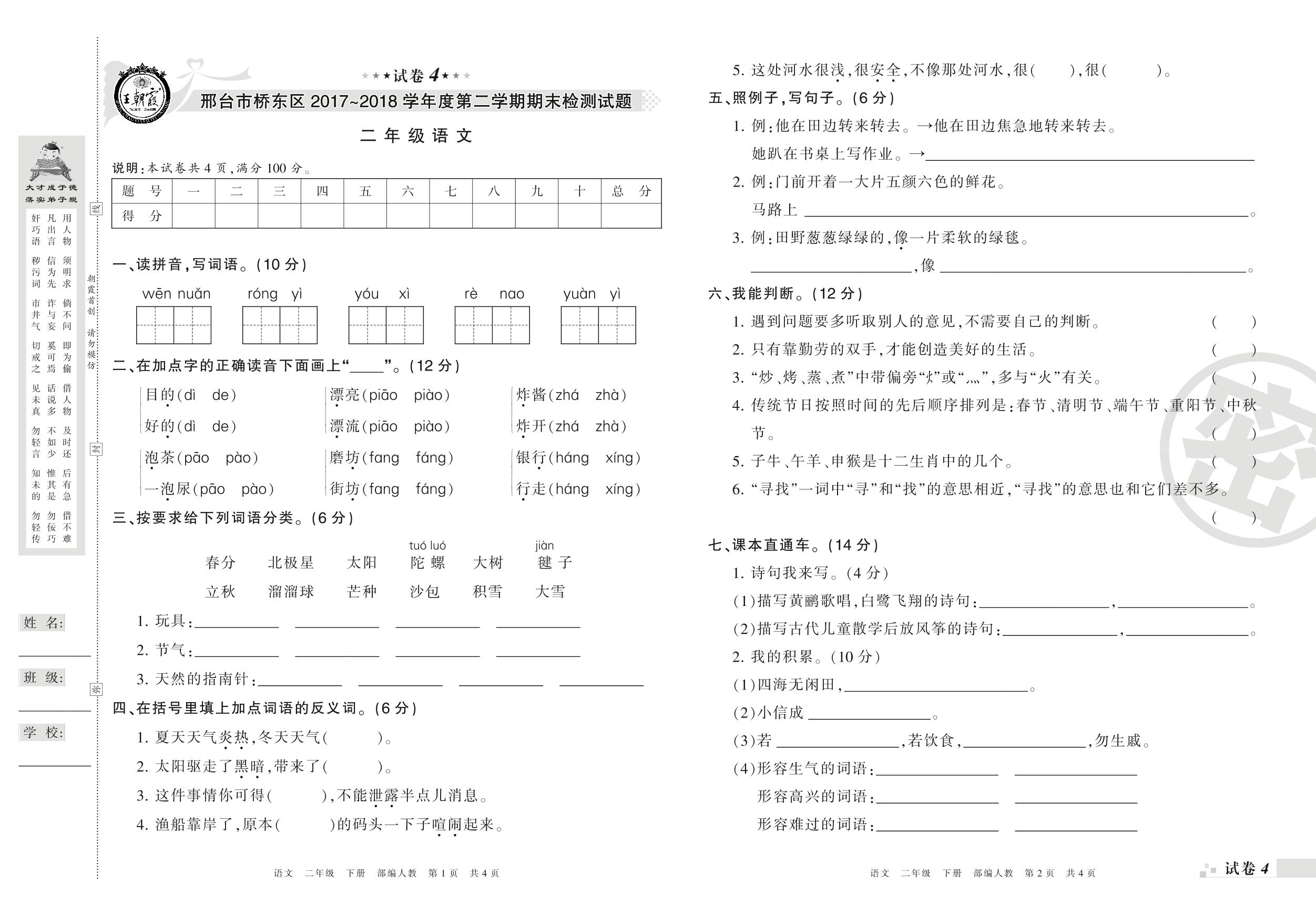 2017-2018学年第二学期邢台市桥东区二年级语文试卷(人教版)【4】