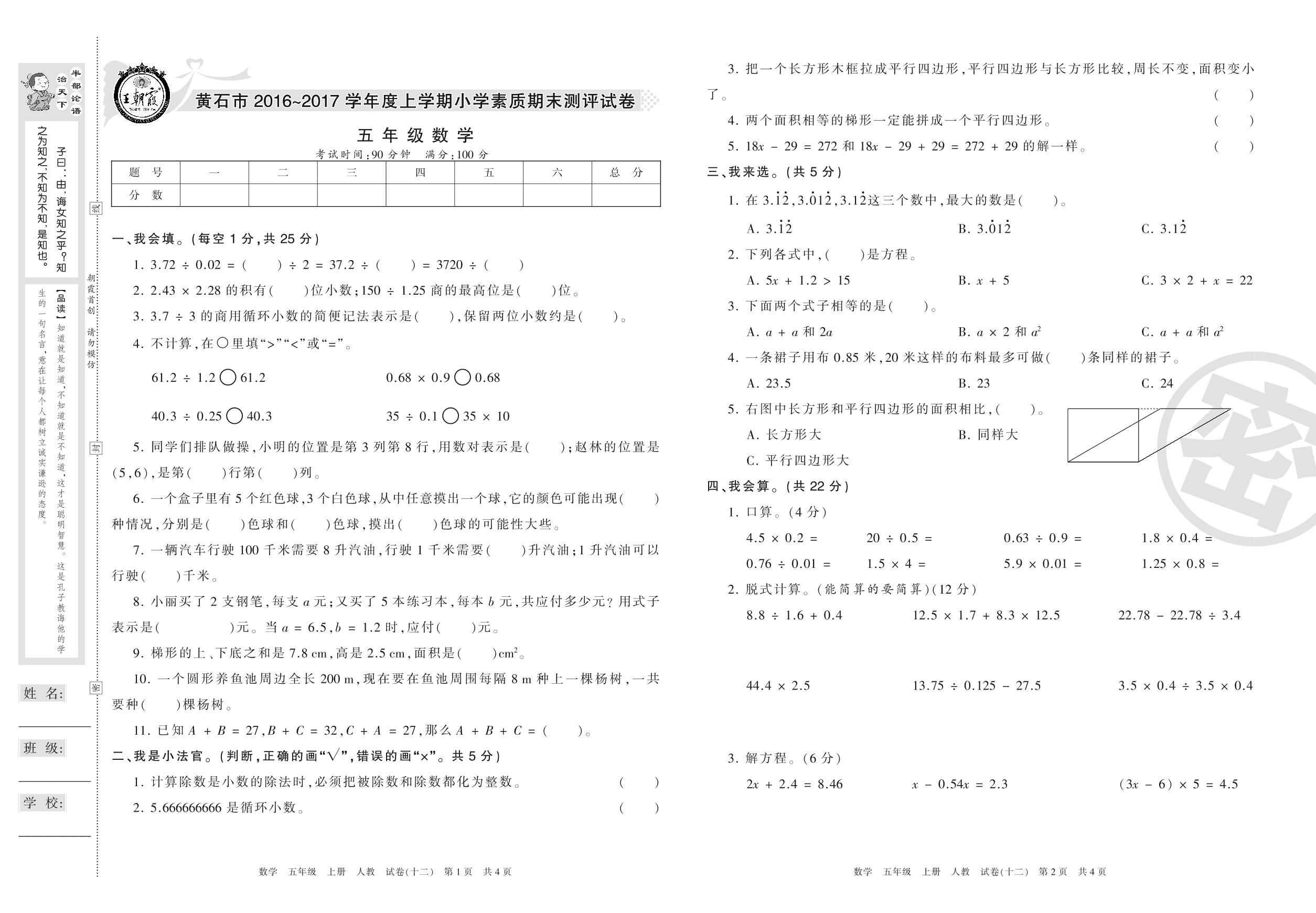 2016-2017学年第一学期黄石市五年级数学试卷(人教版)【12】