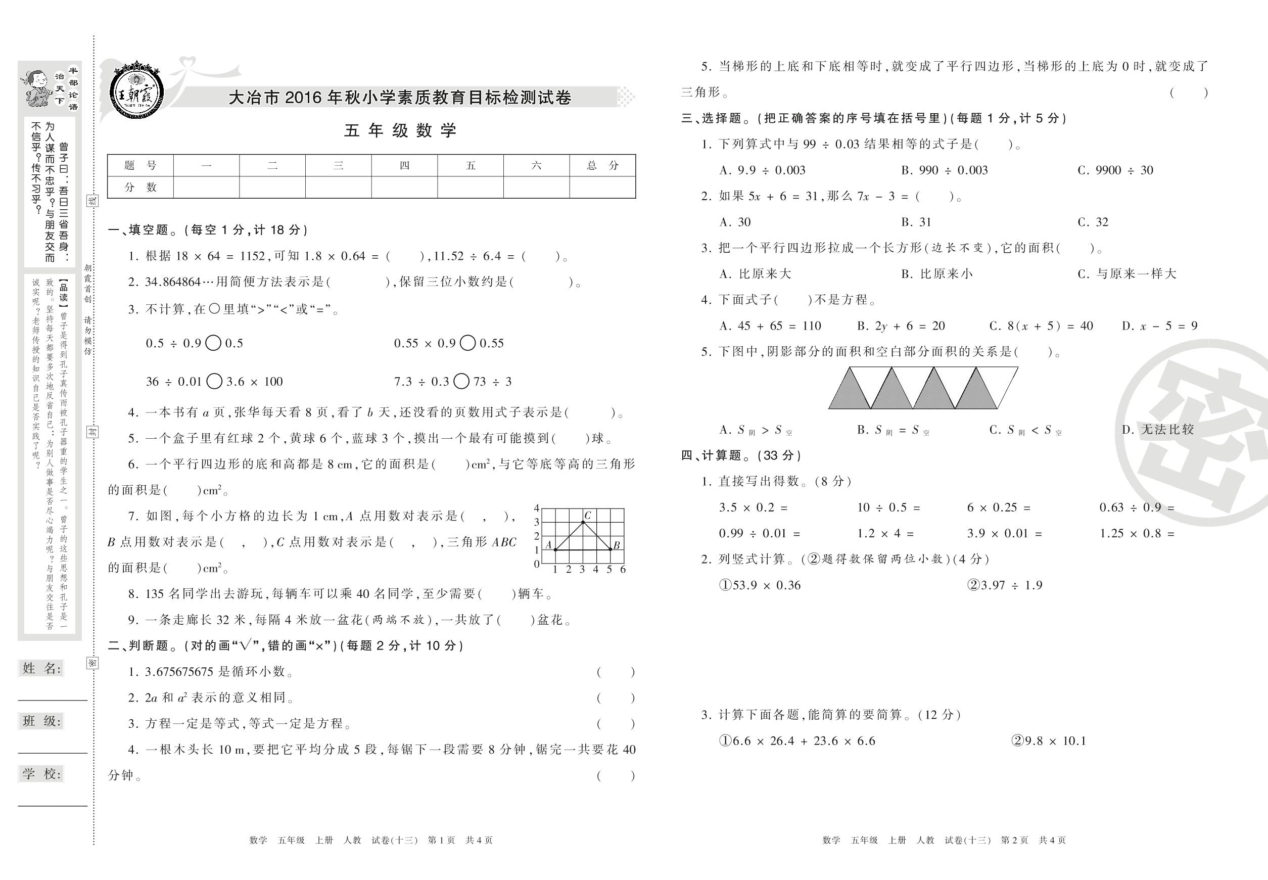2016-2017学年第一学期大冶市五年级数学试卷(人教版)【13】