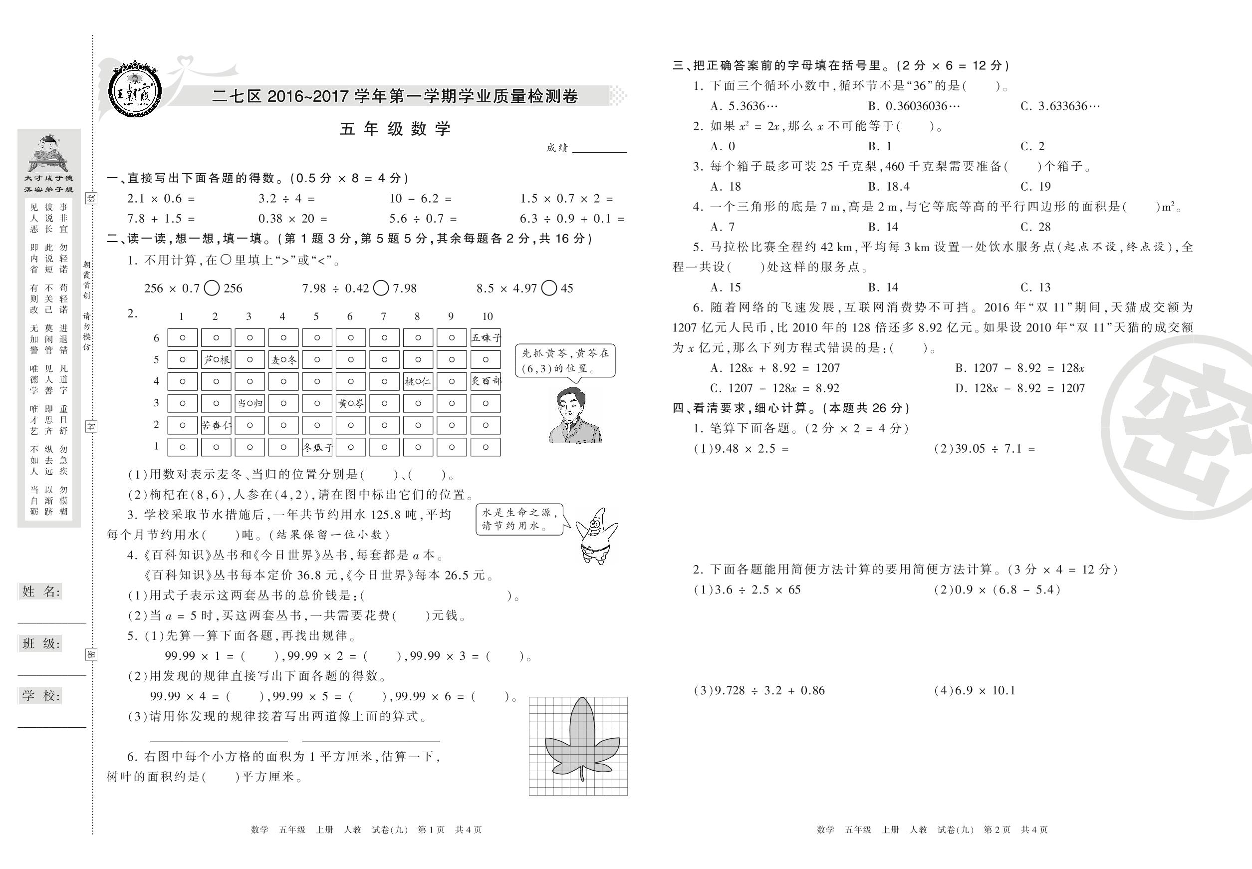 2016-2017学年第一学期郑州市郑汴专版二七区五年级数学试卷(人教版)【9】