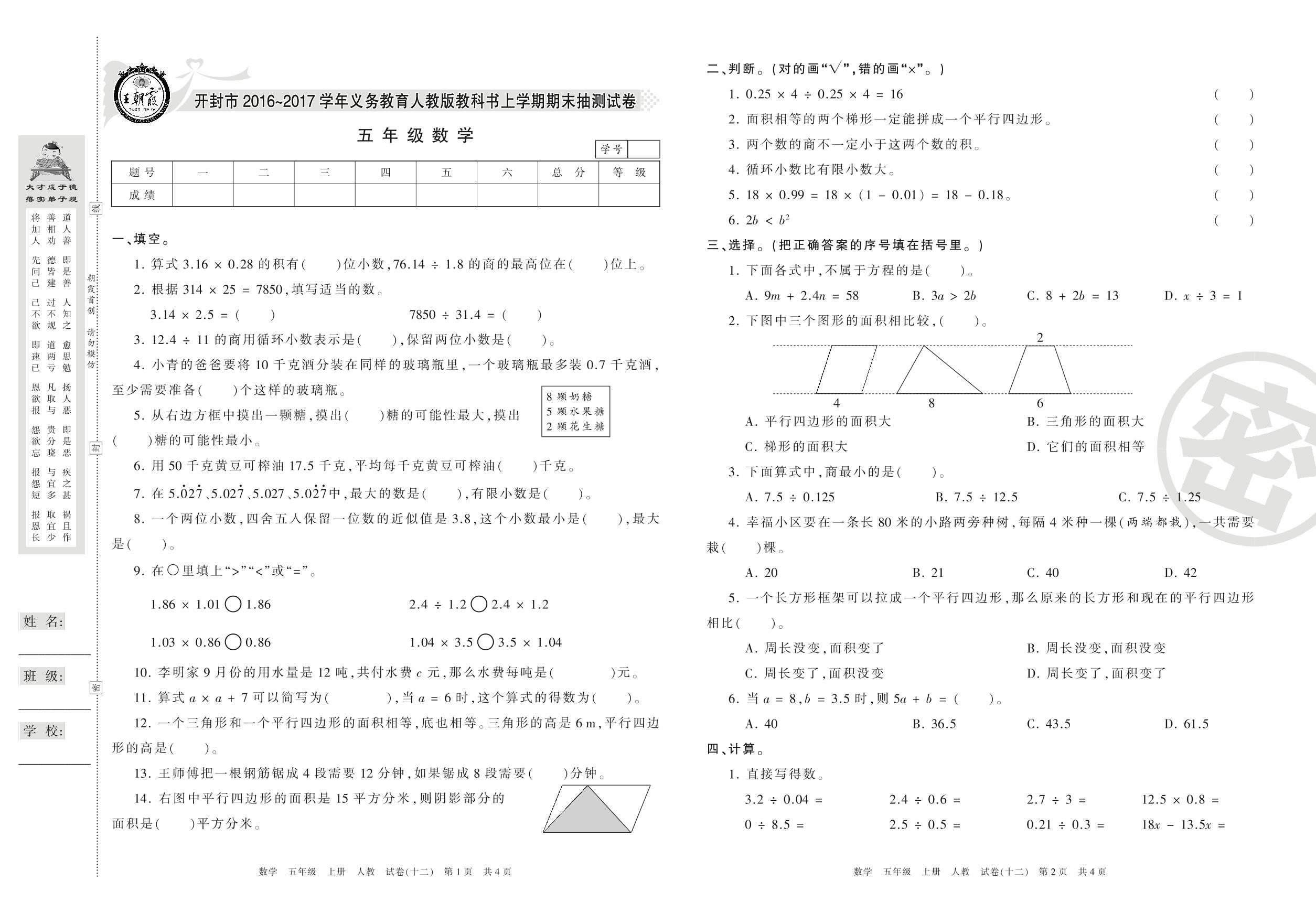2016-2017学年第一学期开封市五年级数学试卷(人教版)【12】