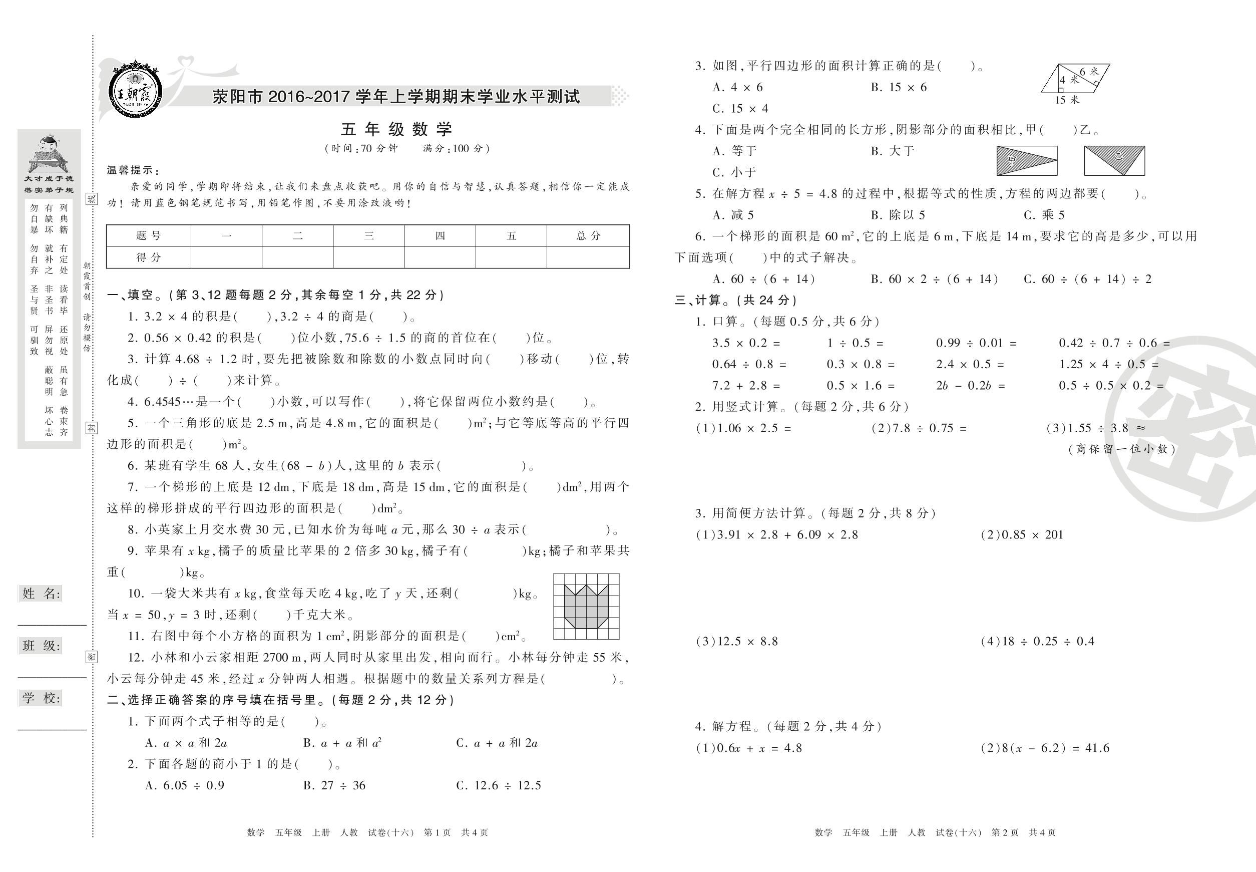 2016-2017学年第一学期荥阳市五年级数学试卷(人教版)【16】