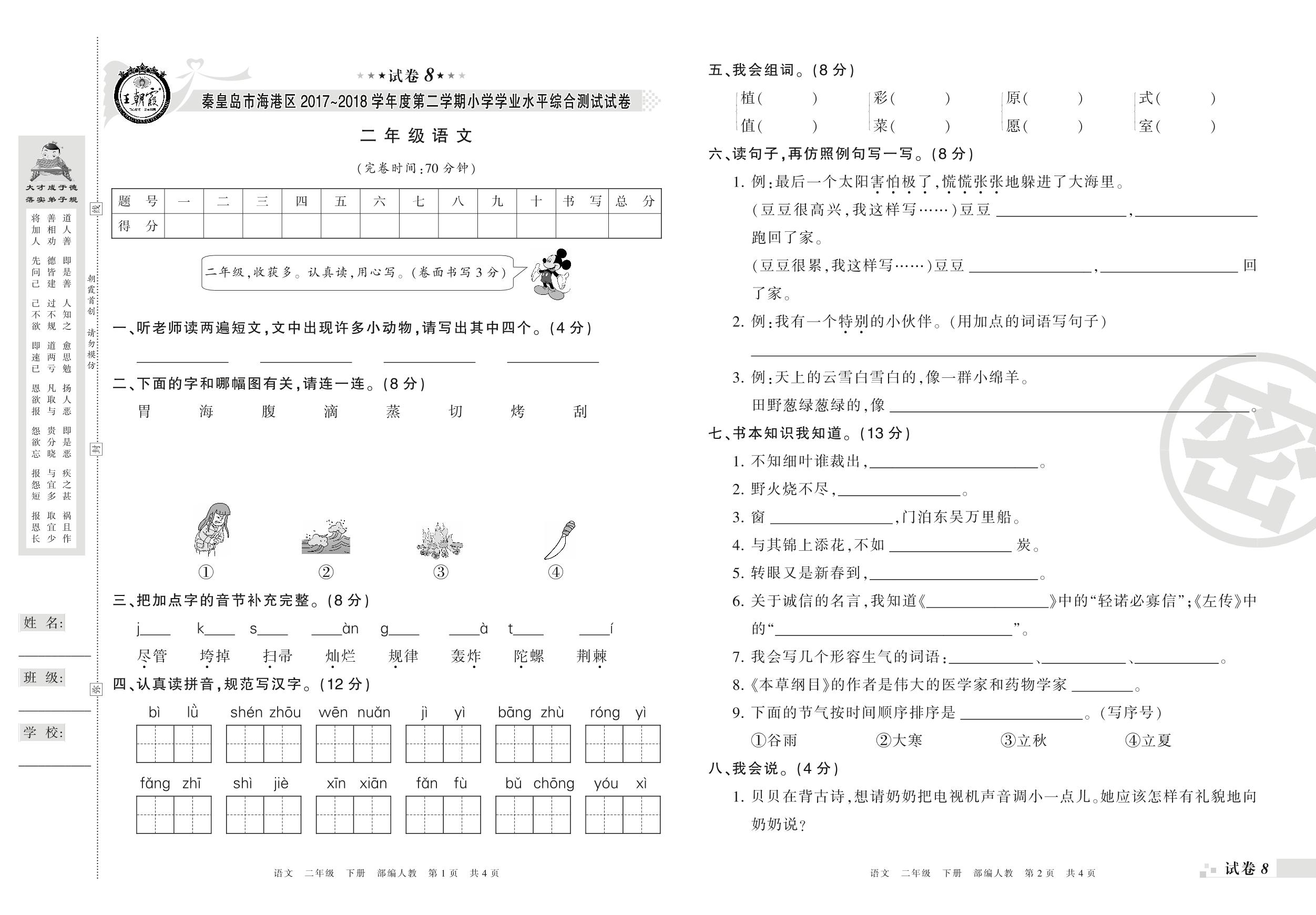 2017-2018学年第二学期秦皇岛市海港区二年级语文试卷(人教版)【8】