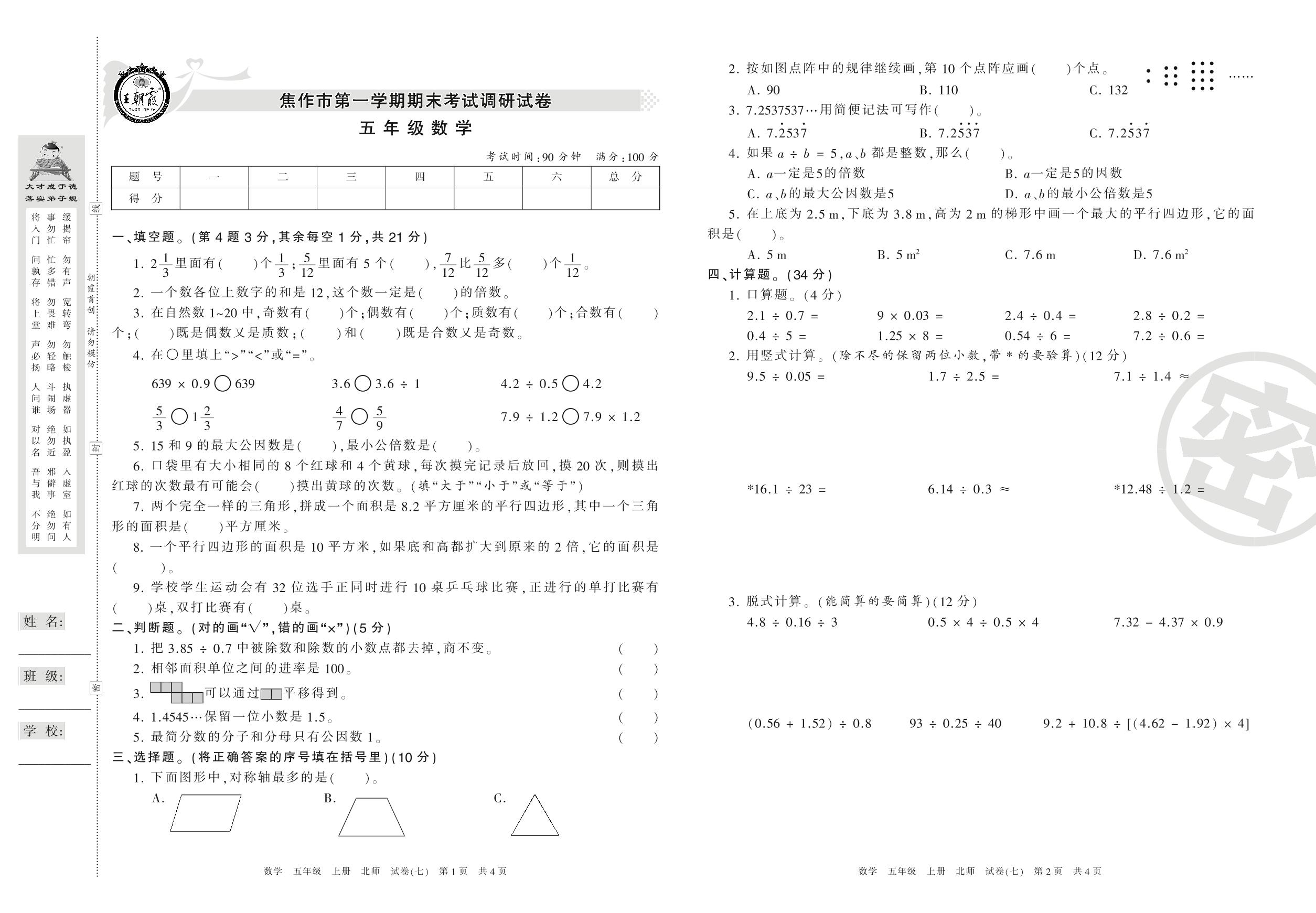 2016-2017学年第一学期焦作市五年级数学试卷(北师版)【7】