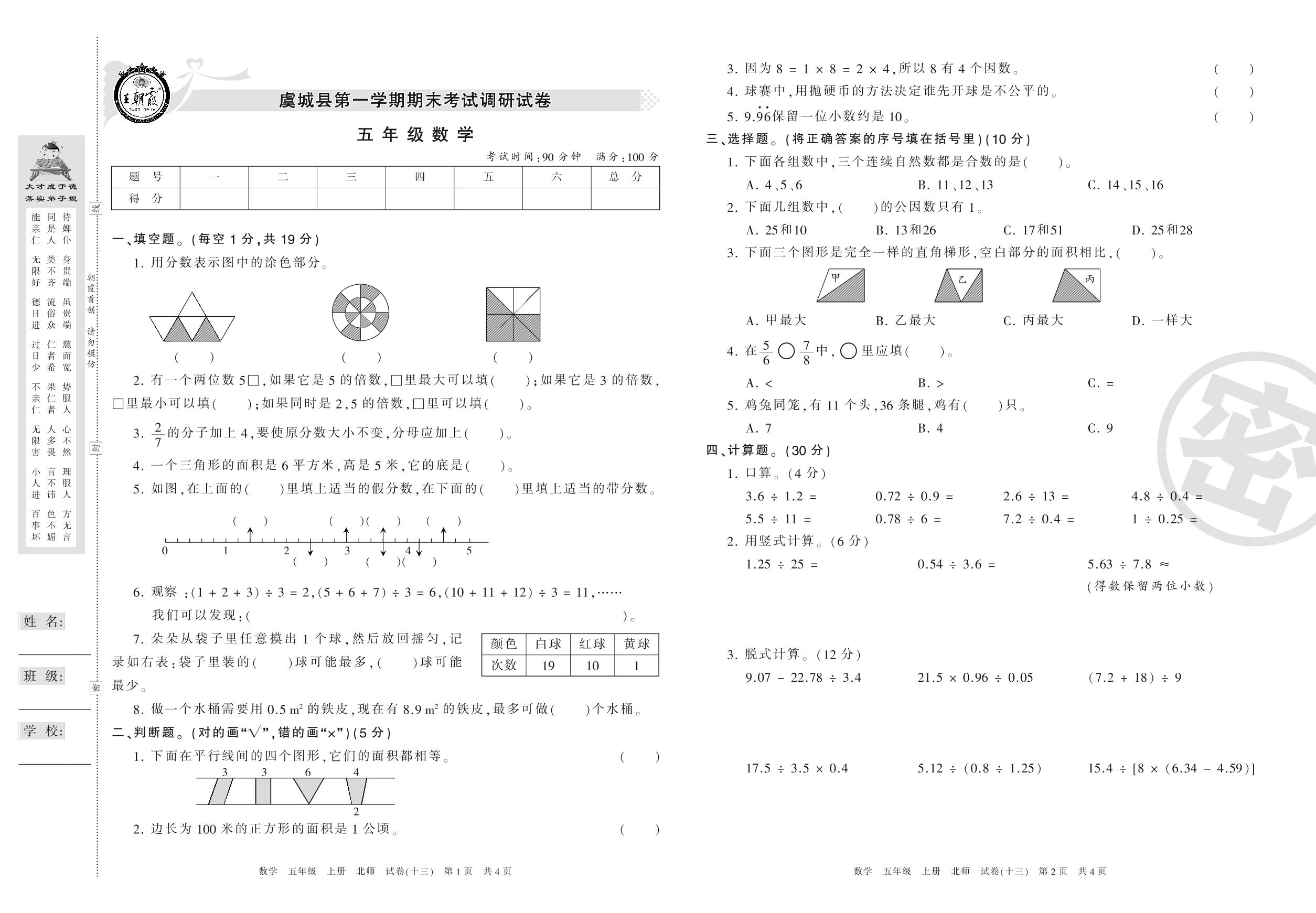 2016-2017学年第一学期商丘市虞城县五年级数学试卷(北师版)【13】