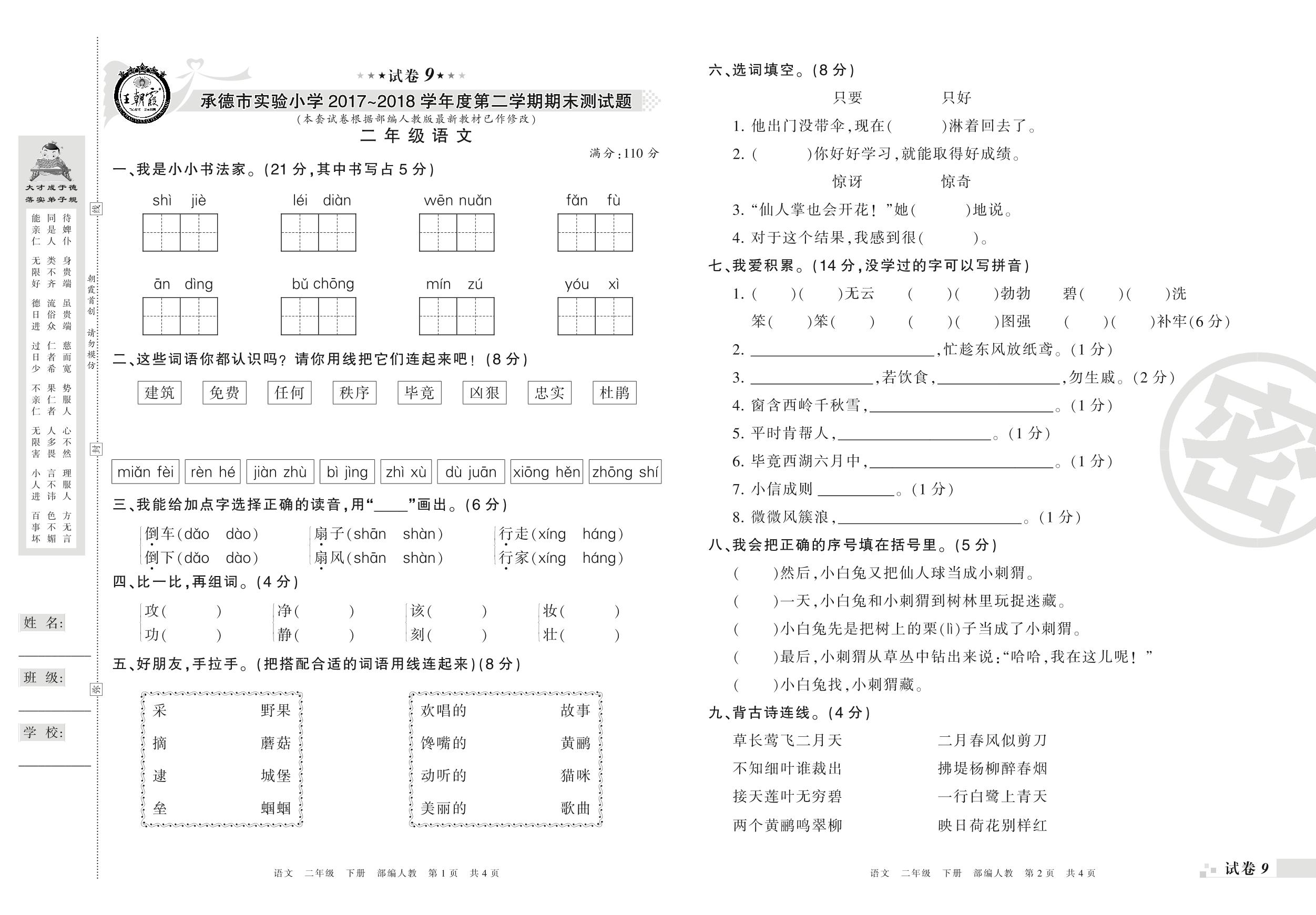 2017-2018学年第二学期承德市实验小学二年级语文试卷(人教版)【9】