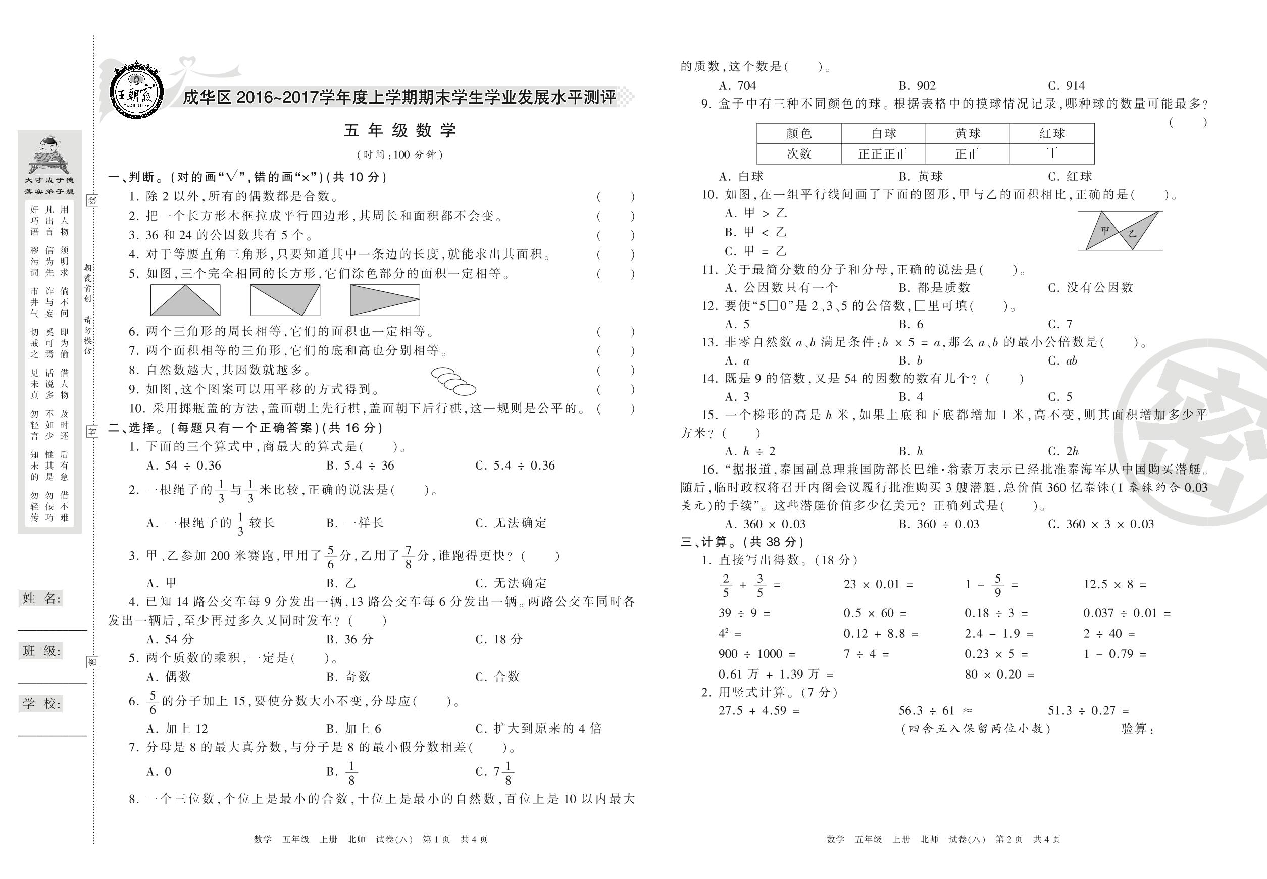 2016-2017学年第一学期成都市成华区五年级数学试卷(北师版)【8】