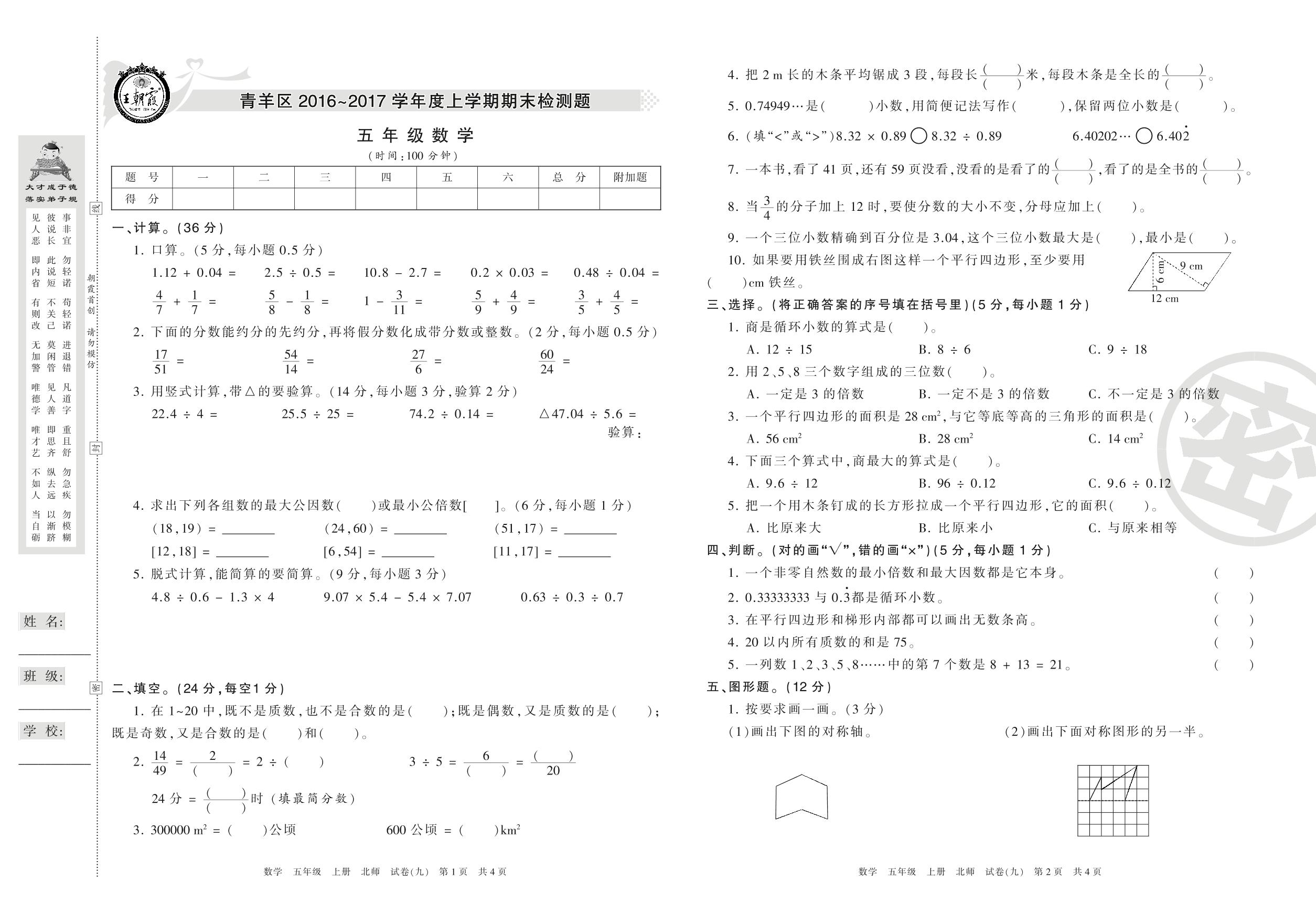 2016-2017学年第一学期成都市青羊区五年级数学试卷(北师版)【9】