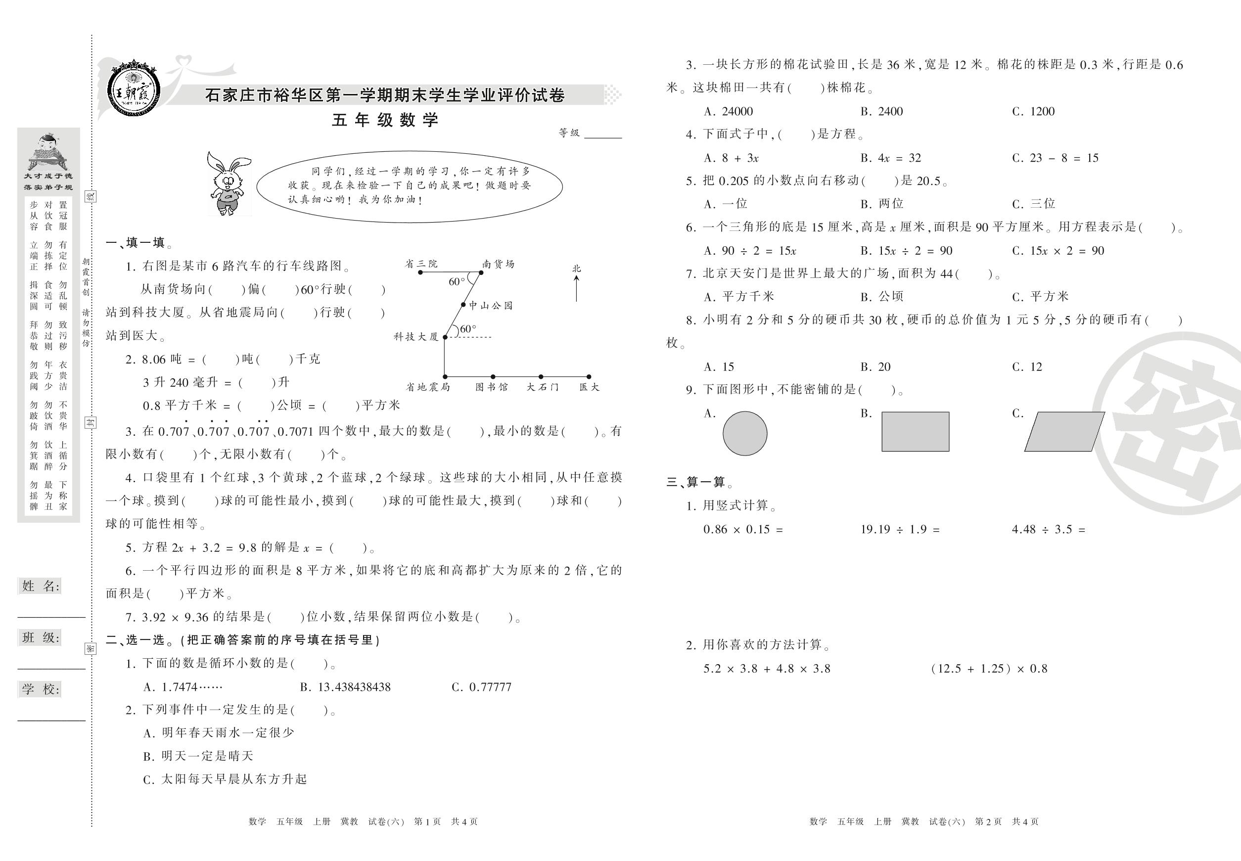 2016-2017学年第一学期石家庄市裕华区五年级数学试卷(冀教版)【6】