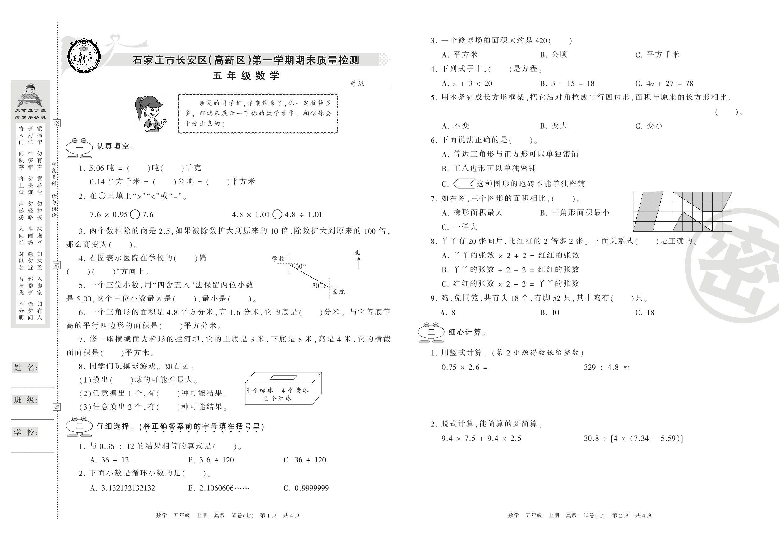 2016-2017学年第一学期石家庄市长安区(高新区)五年级数学试卷(冀教版)【7】