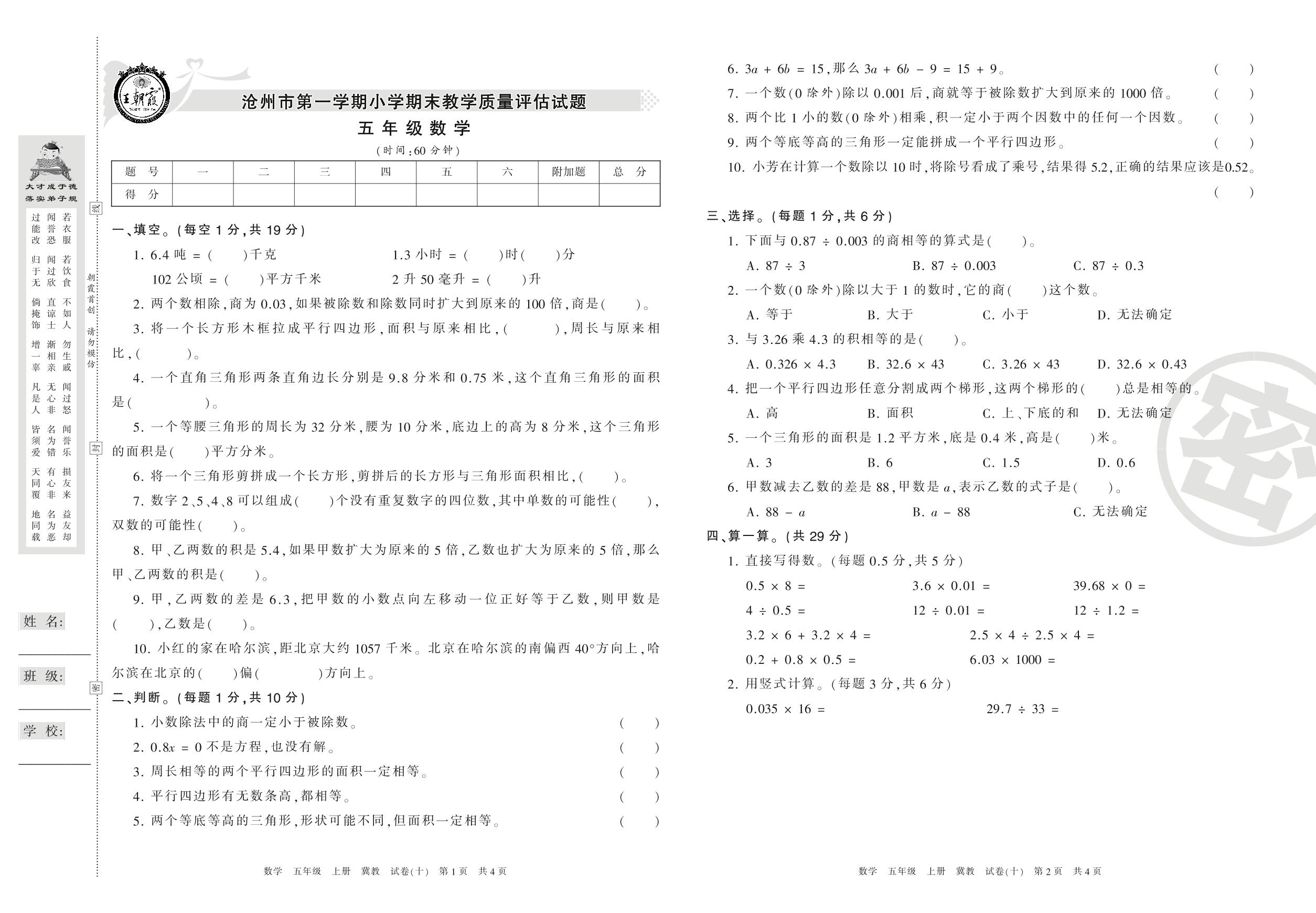 2016-2017学年第一学期沧州市五年级数学试卷(冀教版)【10】