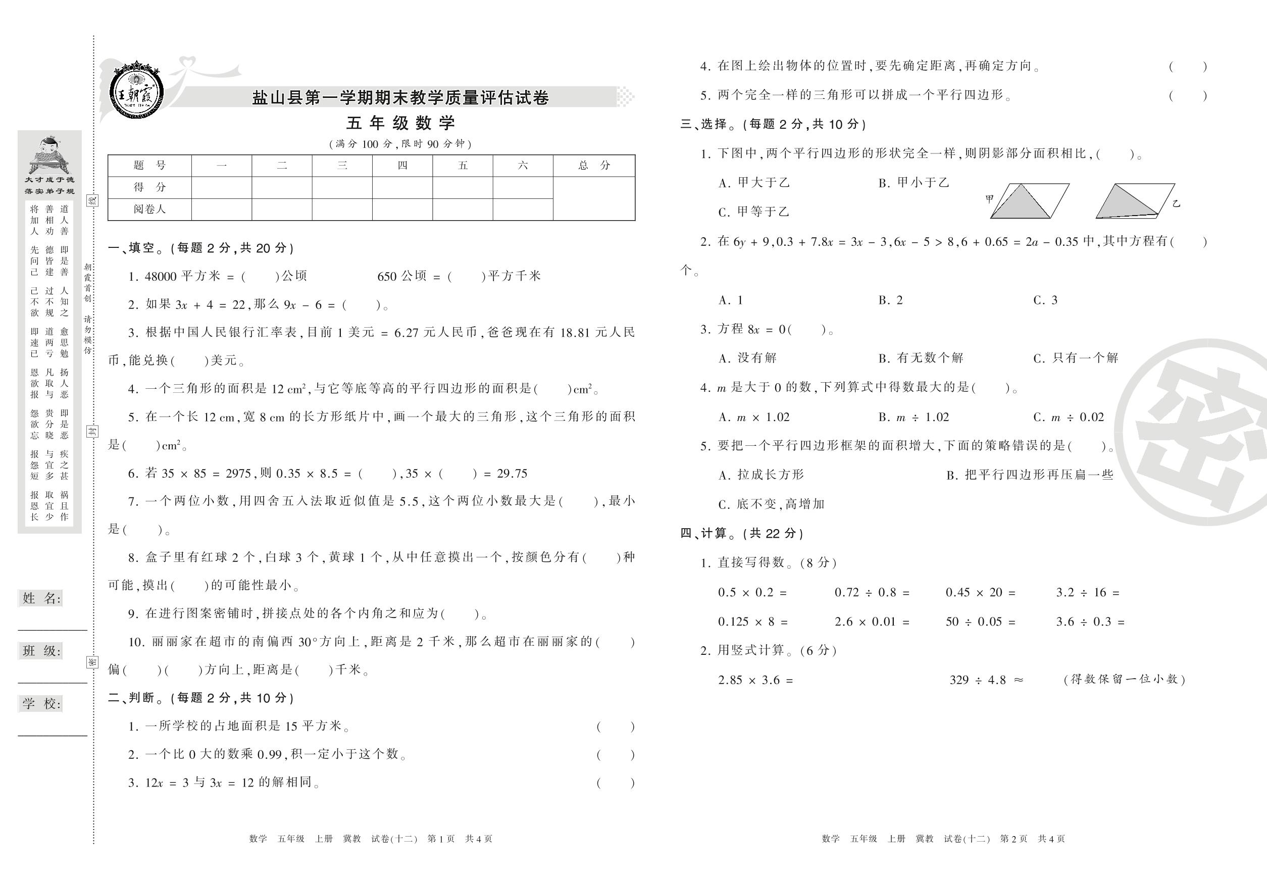 2016-2017学年第一学期沧州市盐山县五年级数学试卷(冀教版)【12】