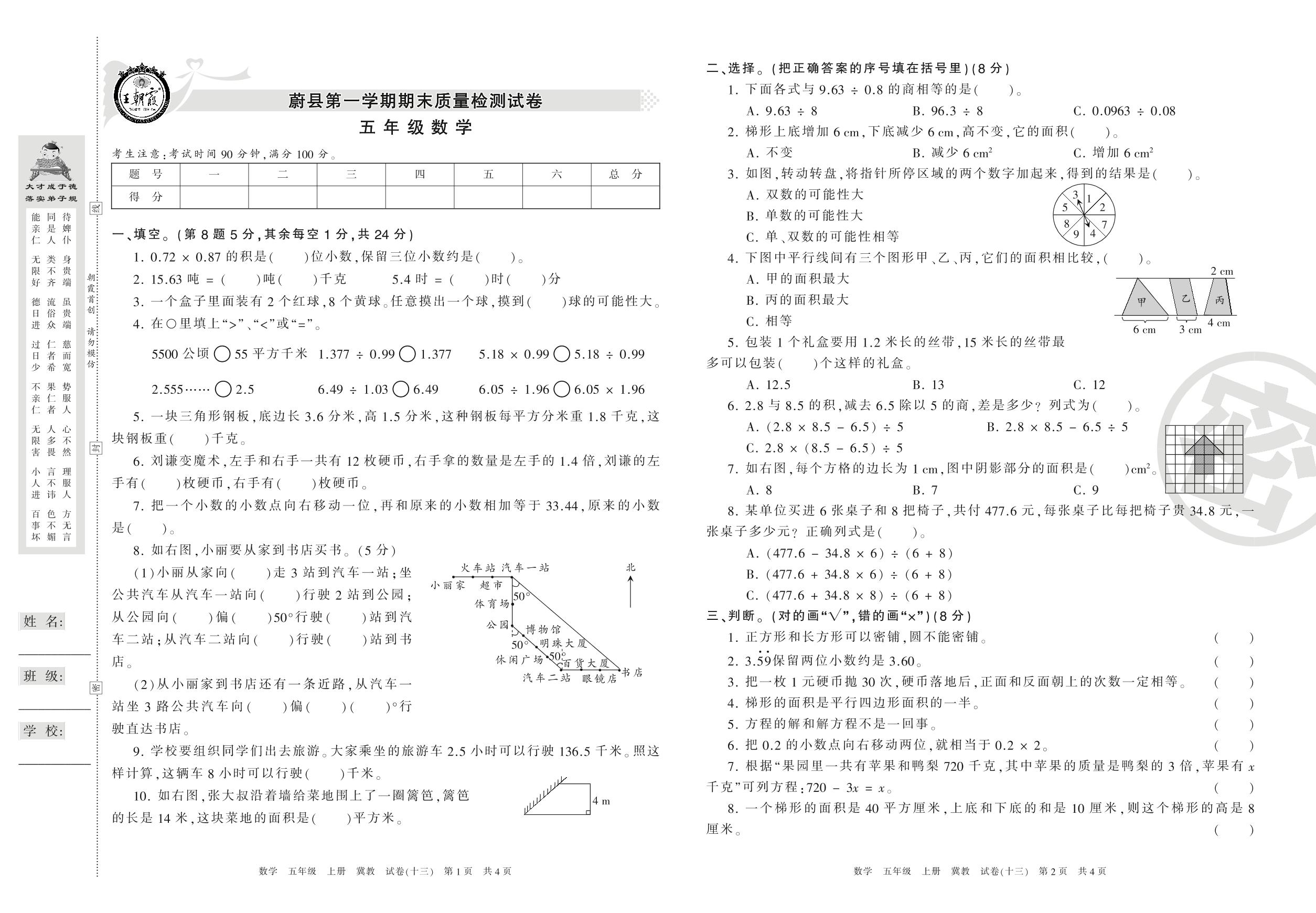 2016-2017学年第一学期张家口市蔚县五年级数学试卷(冀教版)【13】