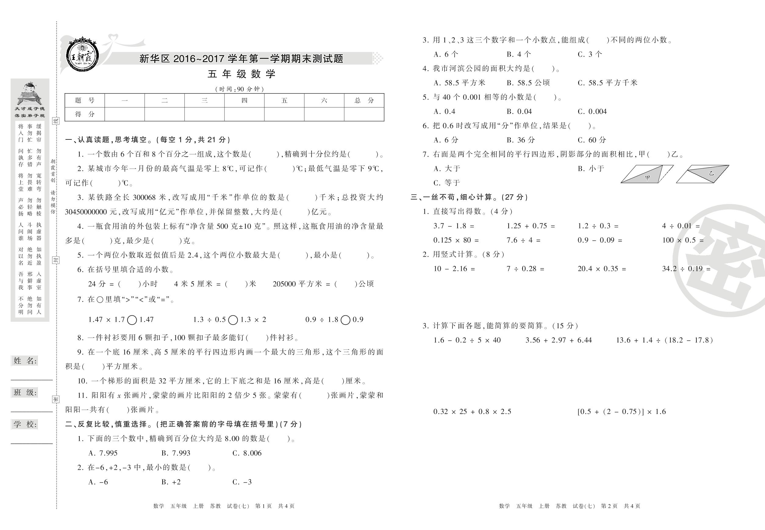 2016-2017学年第一学期平顶山市新华区五年级数学试卷(苏教版)【7】