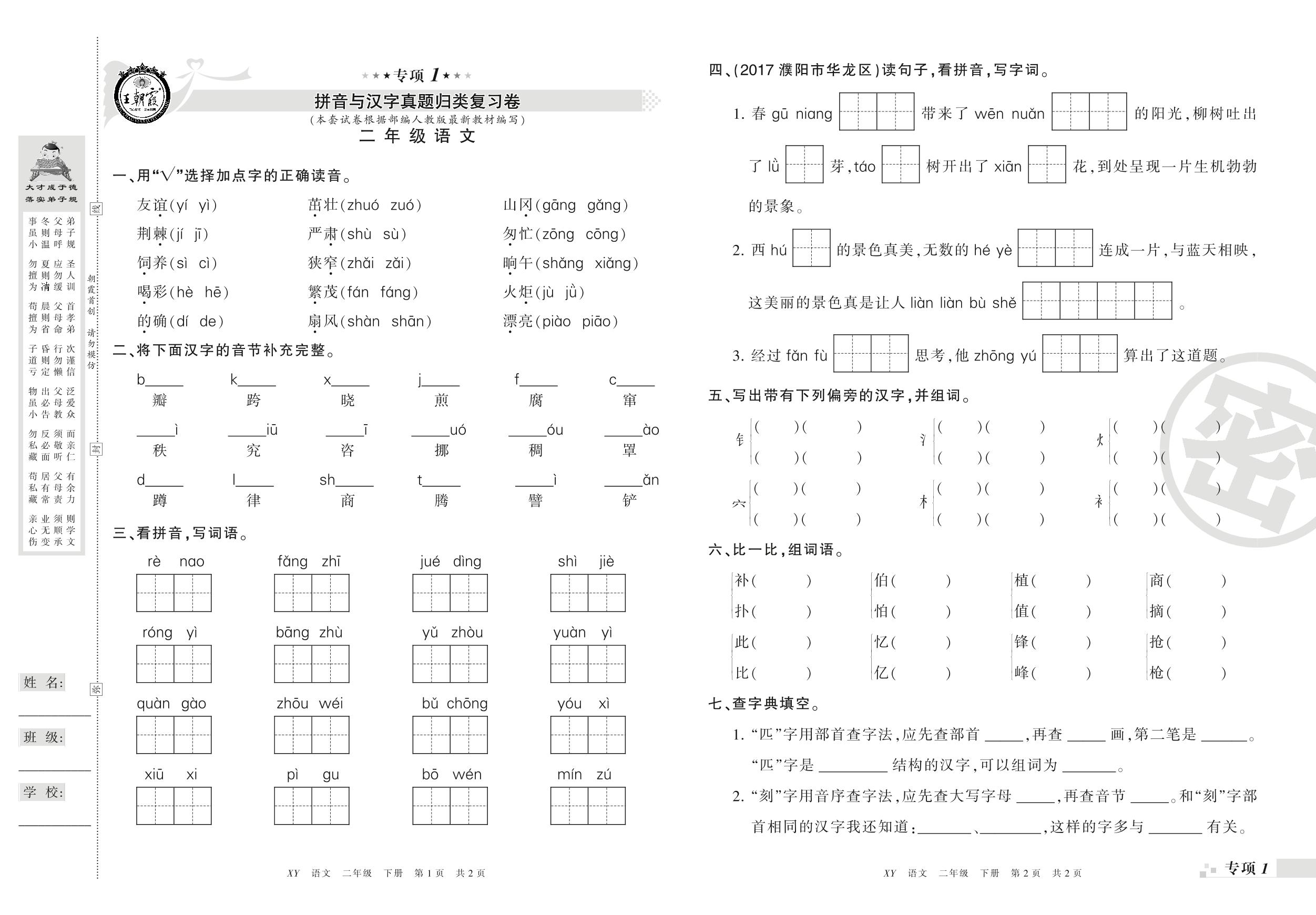 王朝霞期末专项卷——拼音与汉字、词语与句子真题归类复习二年级下册语文(人教版)_R21080171613【0】