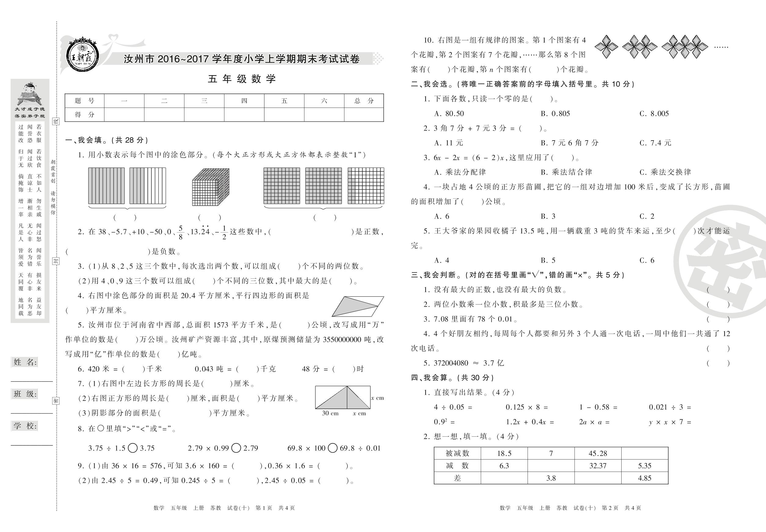 2016-2017学年第一学期汝州市五年级数学试卷(苏教版)【10】