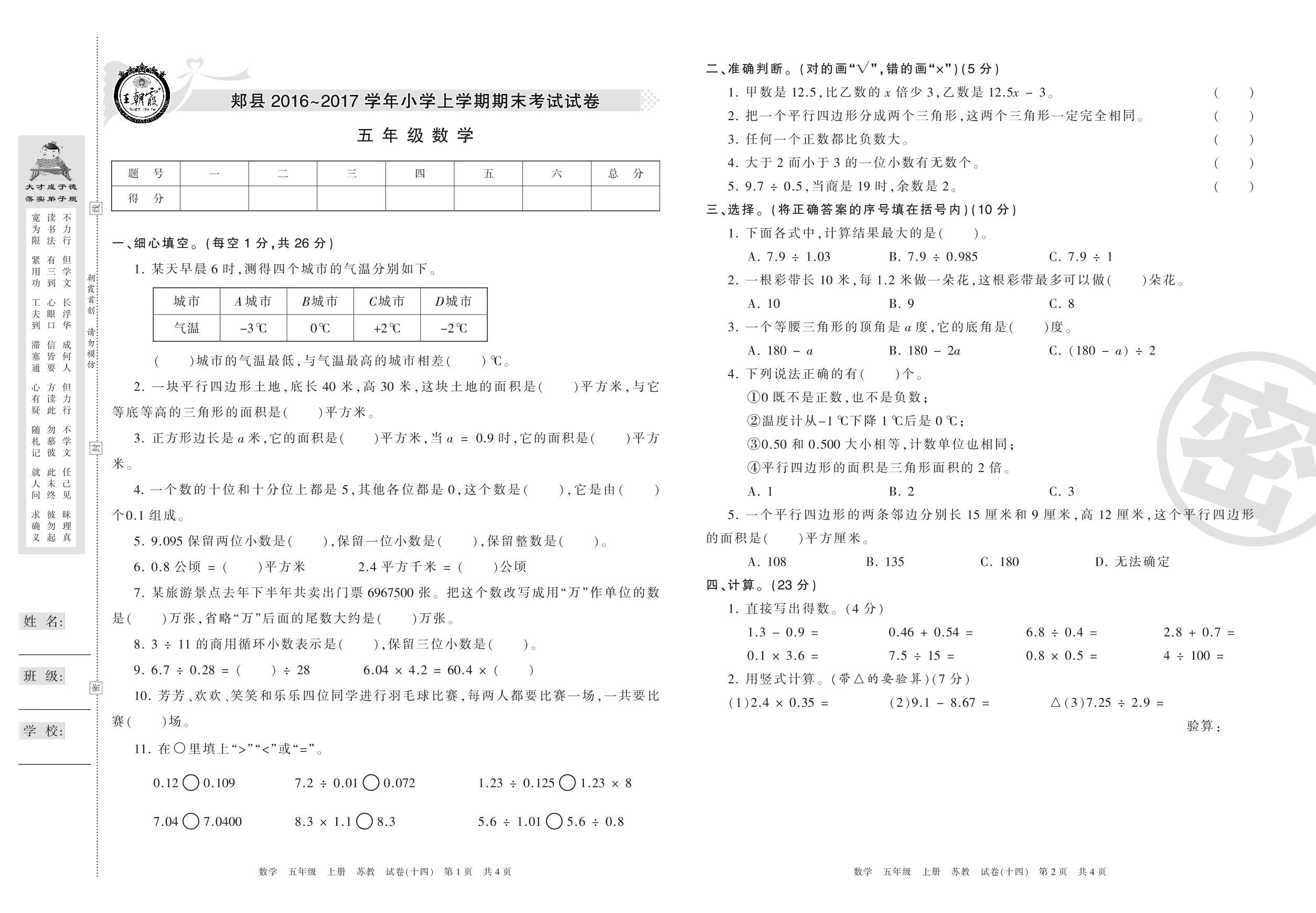 2016-2017学年第一学期平顶山市郏县五年级数学试卷(苏教版)【14】