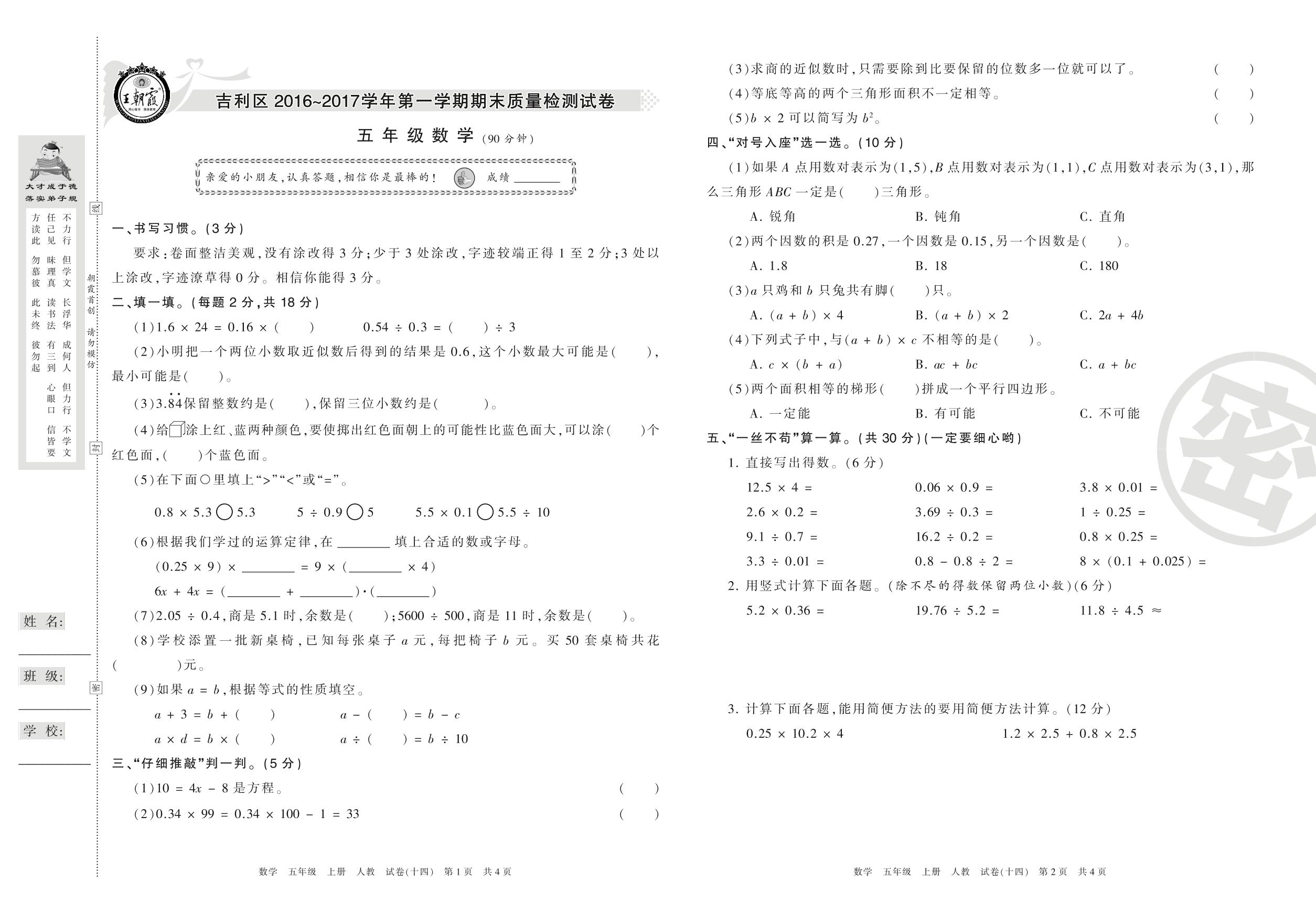 2016-2017学年第一学期洛阳市吉利区五年级数学试卷(人教版)【14】