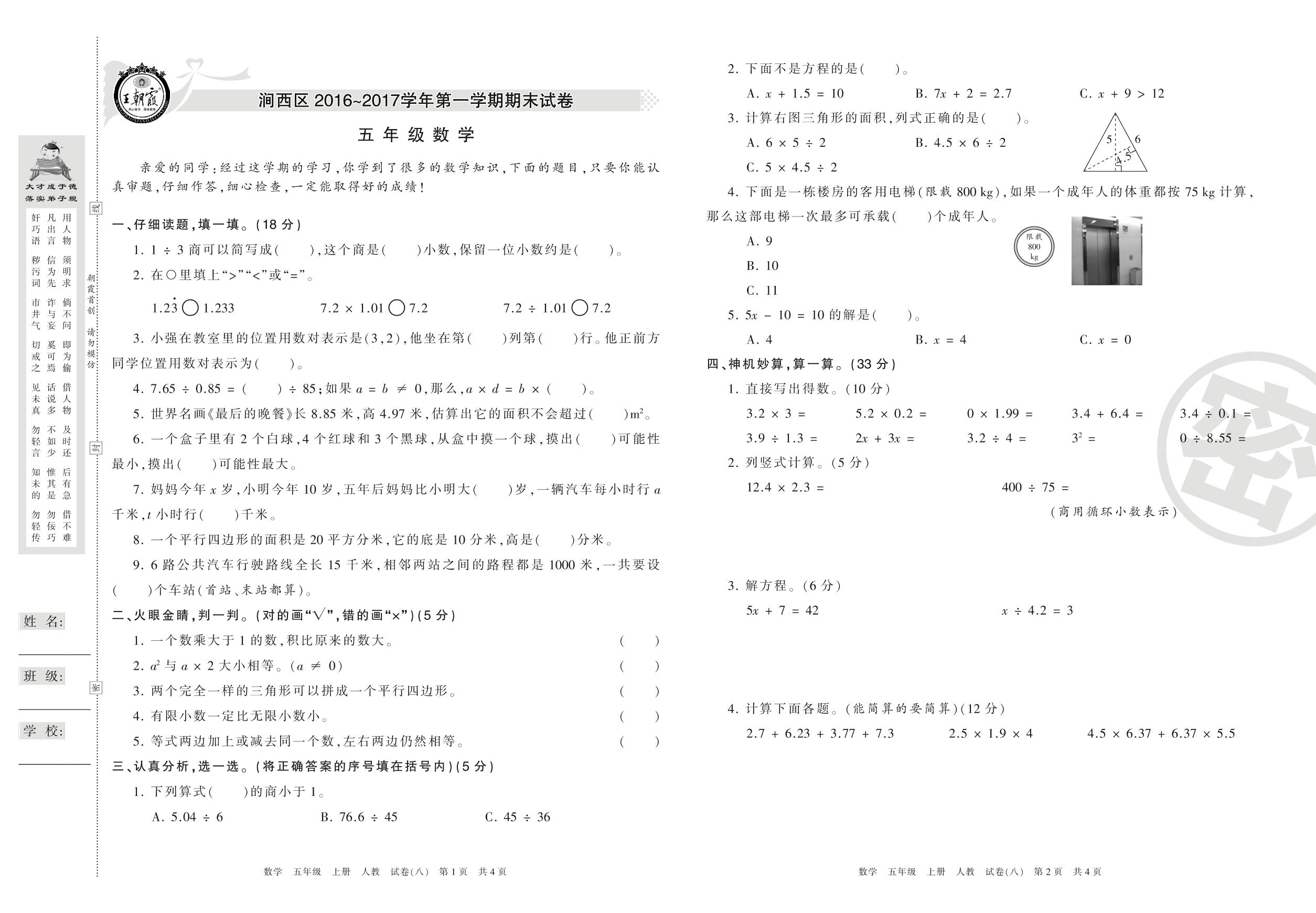 2016-2017学年第一学期洛阳市涧西区五年级数学试卷(人教版)【8】