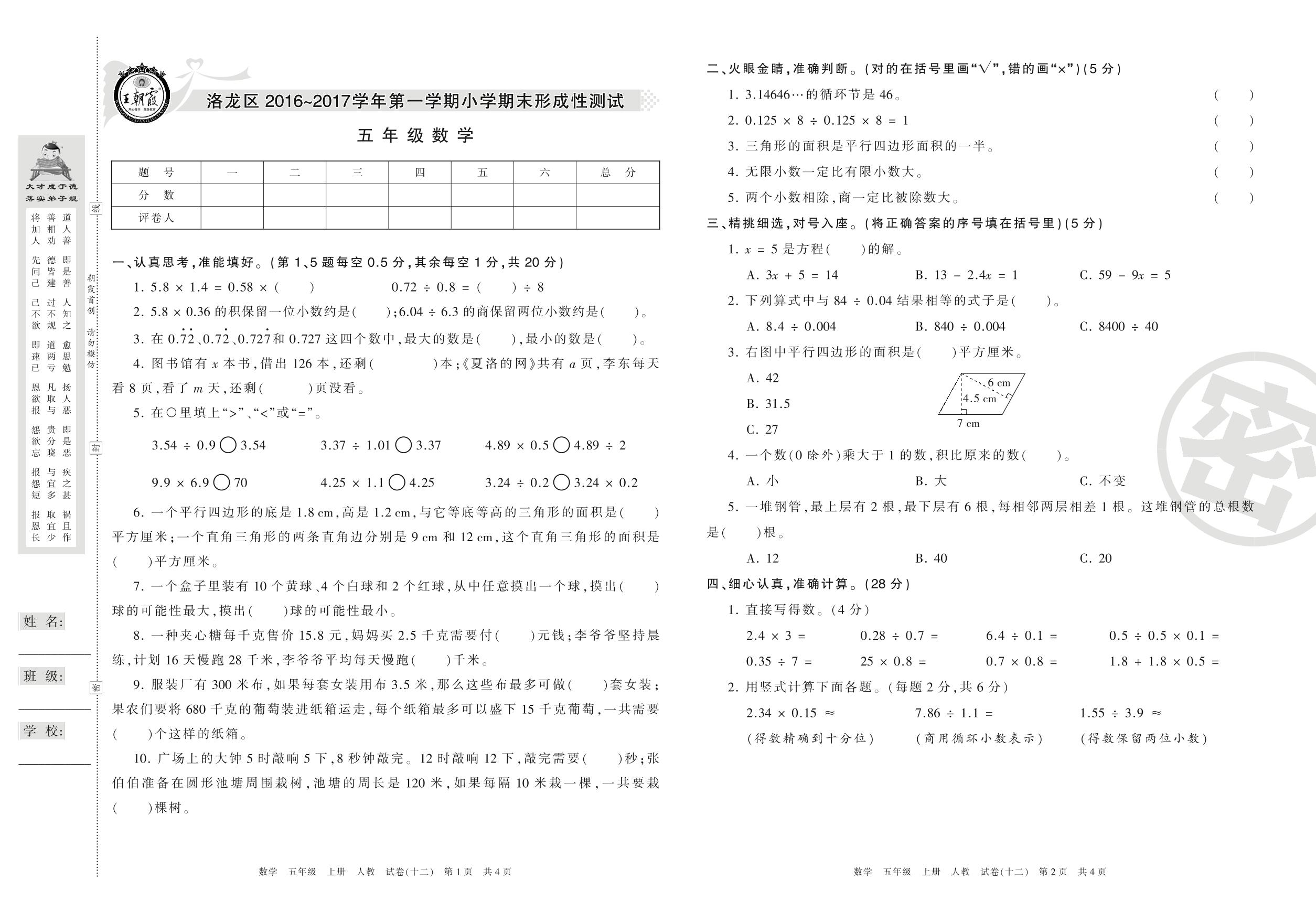 2016-2017学年第一学期洛阳市洛龙区五年级数学试卷(人教版)【12】