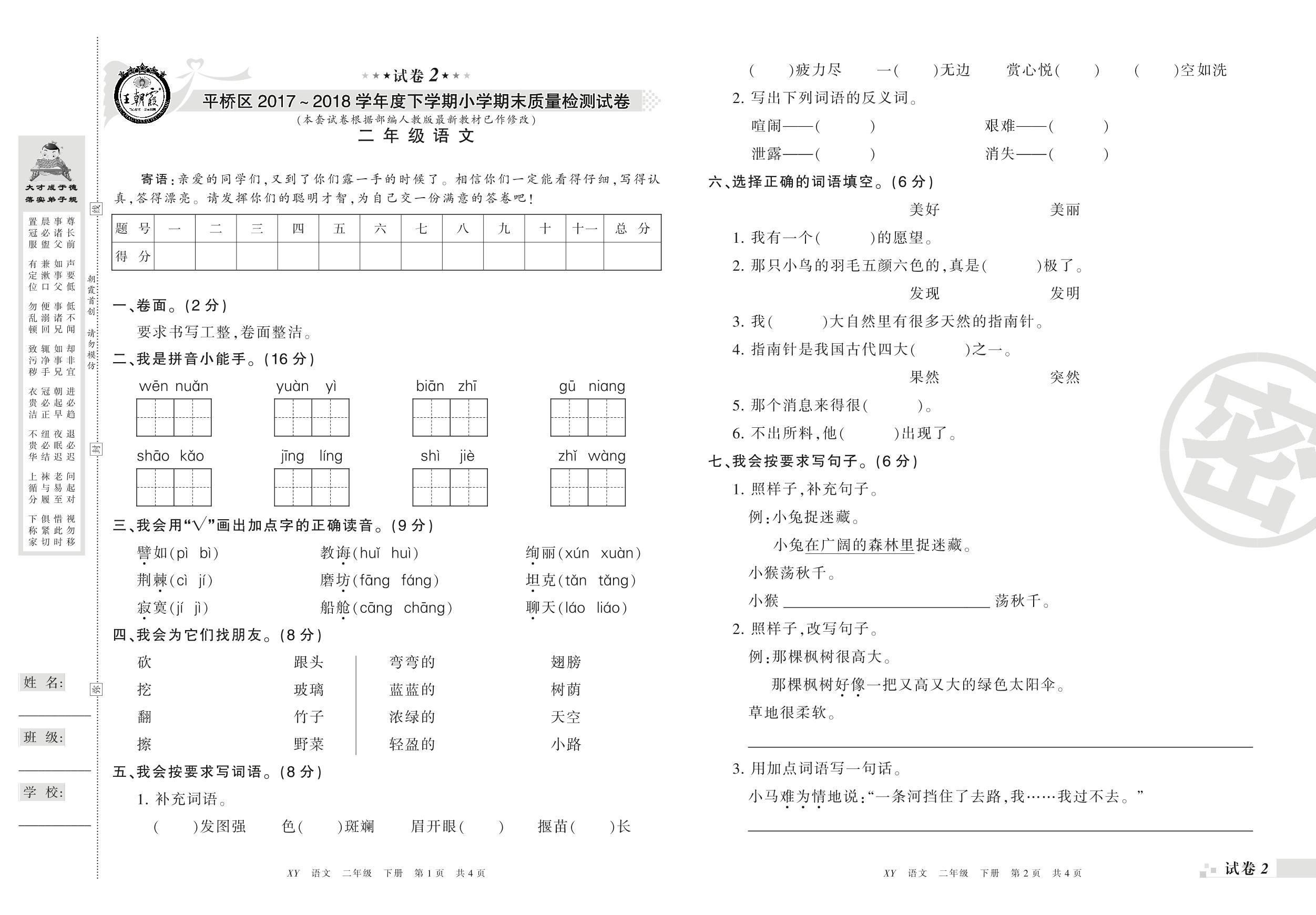 2017-2018学年第二学期信阳市平桥区二年级语文试卷(人教版)【2】