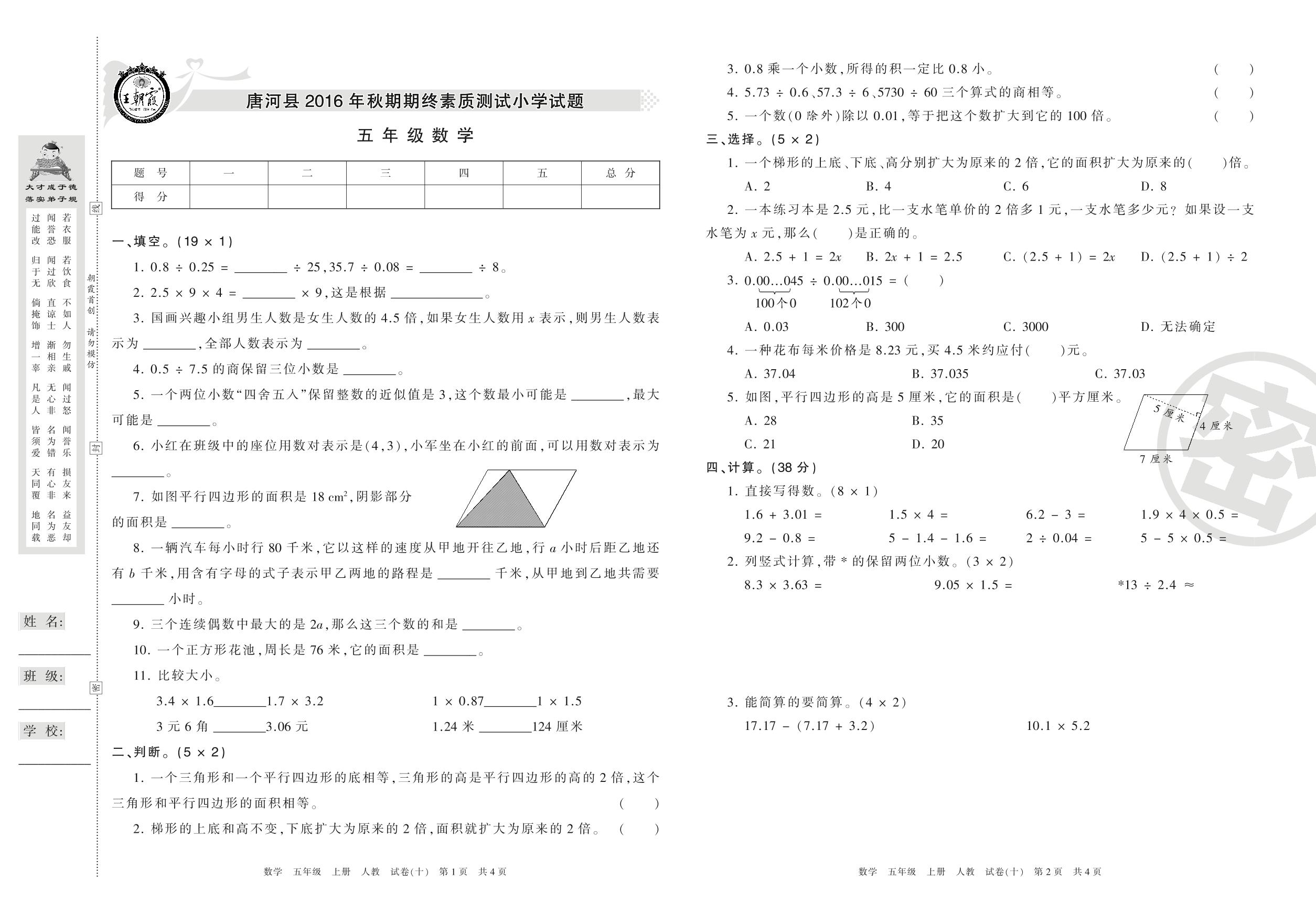 2016-2017学年第一学期南阳市唐河县五年级数学试卷(人教版)【10】