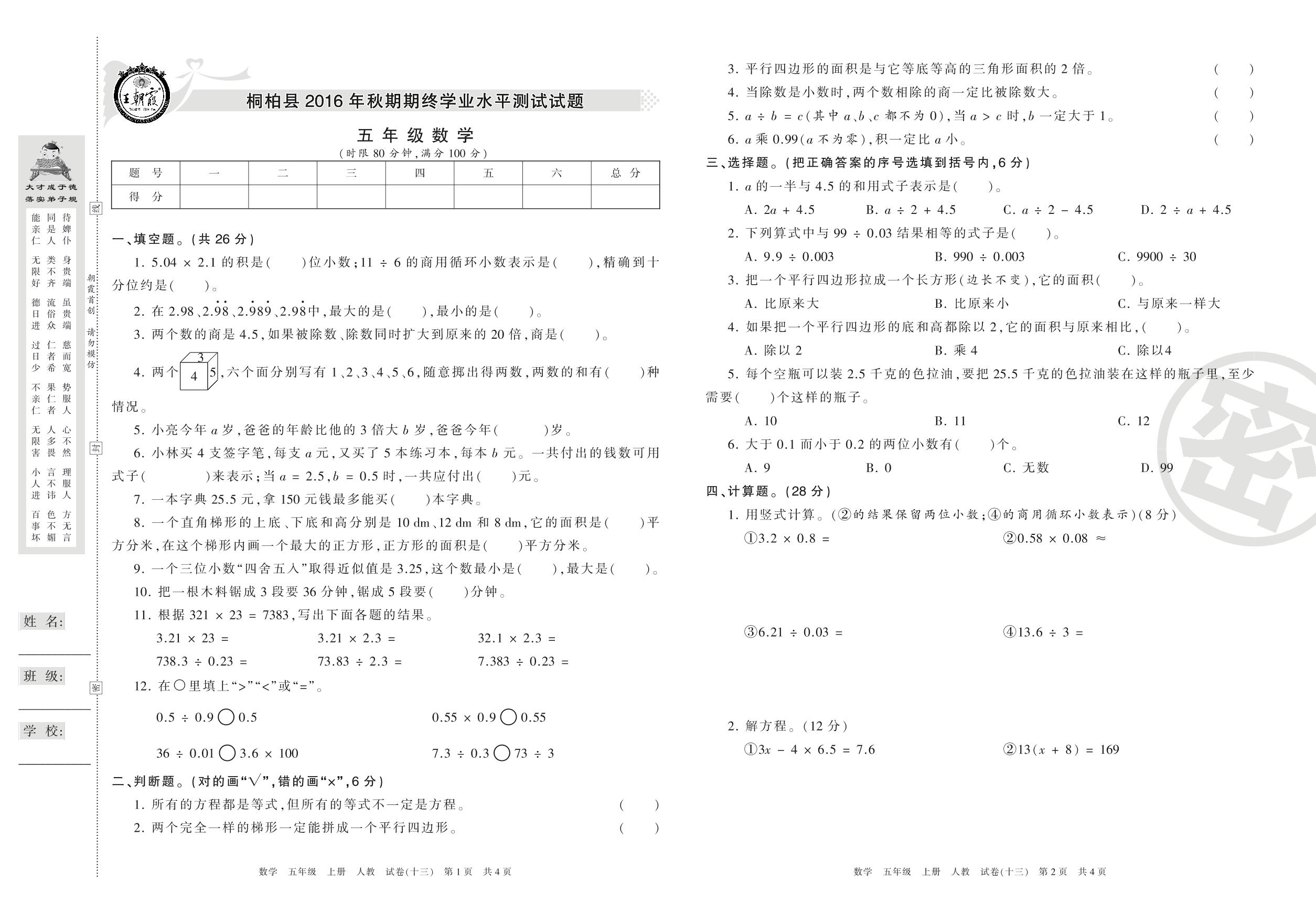 2016-2017学年第一学期南阳市桐柏县五年级数学试卷(人教版)【13】