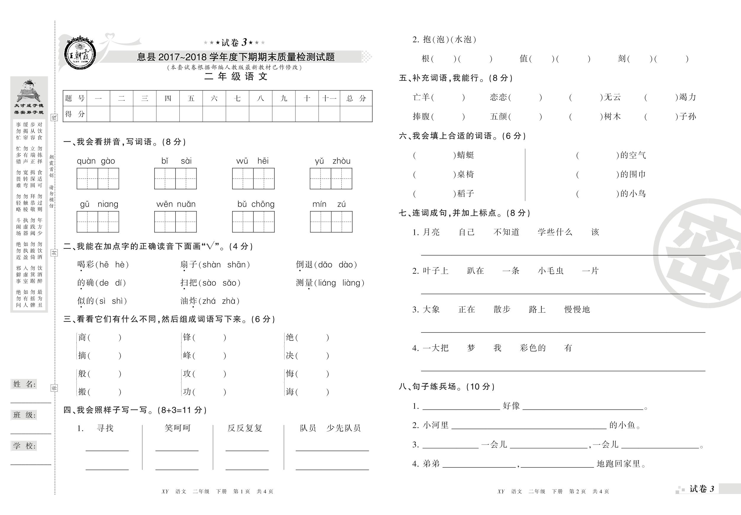 2017-2018学年第二学期信阳市息县二年级语文试卷(人教版)【3】